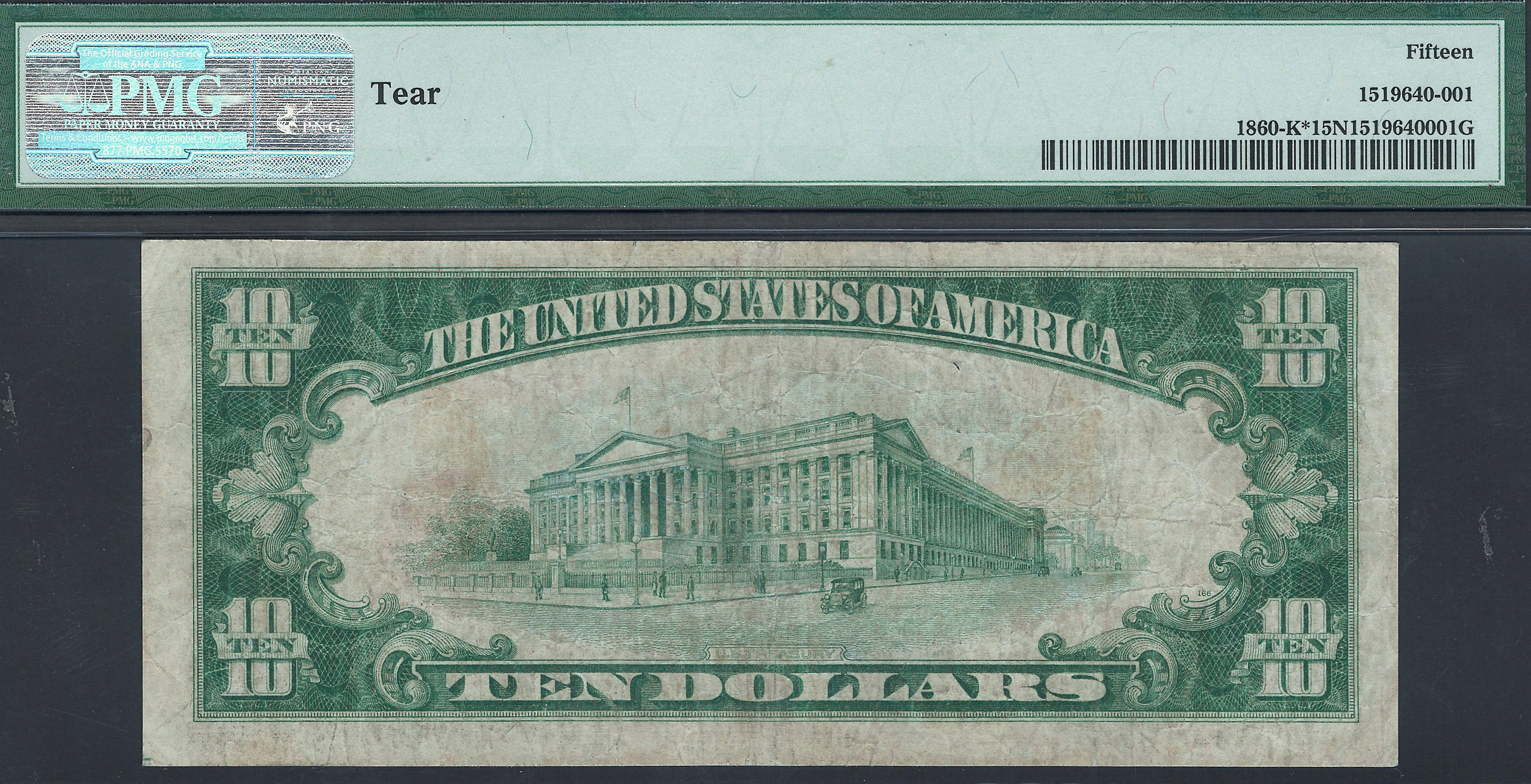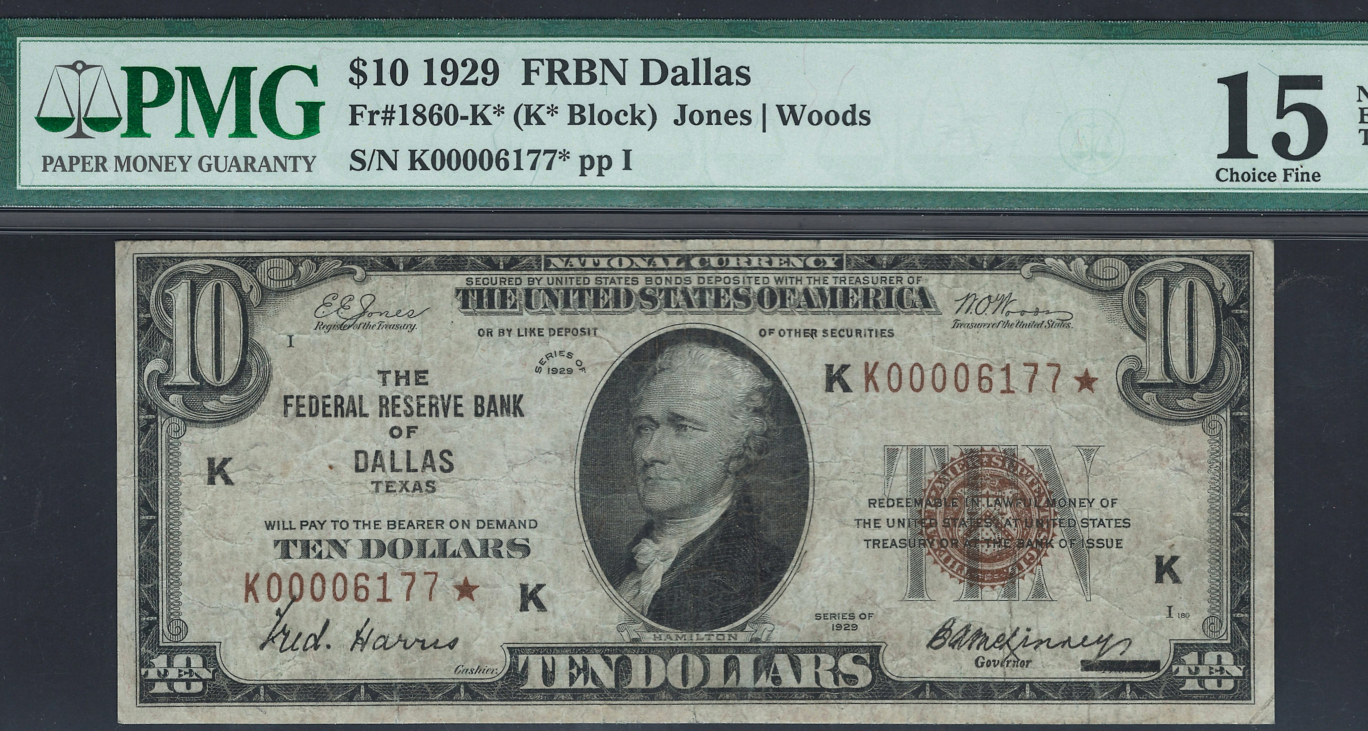 This 1929 $10 FRBN Star is from the rare Dallas district. It is one of the rarest FRBN stars Known. There are a total of 4 known. I know this because I keep the census for the currency market. I owned one other one a few years back and sold it for $13,500 when sold off my FRBN star collection. This example came of nowhere from a North Carolina coin shop two years ago. He called me and I bought it on the spot. I'm just now listing it because I liked having it in my display cases at shows. It's now time to pass it off to the serious collectors who are vying to complete their sets. Only 4 people can as they will need this one. The serial number is K00006177 and it is in a PMG F-15. Believe it or not this is about the average grade of the four.
