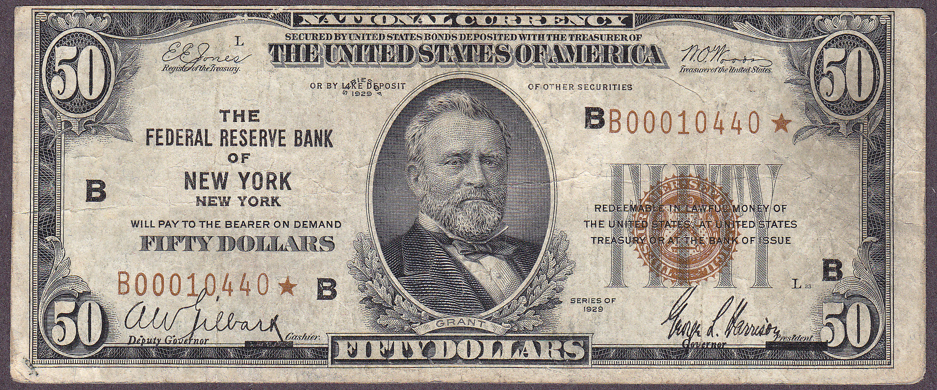 This is a 1929 $50 FRBN star from the New York district. There were only 24,000 printed and 44 have survived. The serial number is B00010440*. This PCGS-20 Very Fine Note has no visible rips, tears or pinholes. See the large scans for additional details.
