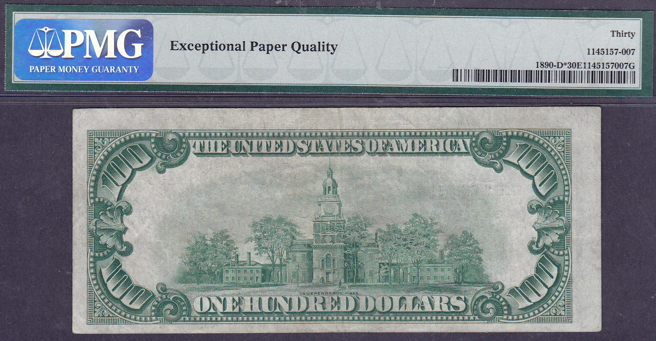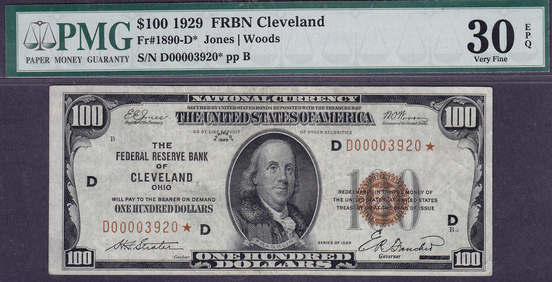 POP1/0 finer. This is a 1929 $100 FRBN Star note is from the Cleveland District of which only 9 are known. This PMG VF-30EPQ $100 FRBN star is the FINEST KNOWN of the nine known. Most are in fine or below grade with major problems. It features the Serial Number D00003920*. There are no rips, tears, pinholes or stains. PMG has given it the Exceptional Paper Quality designation. That means that it is totally original, never press or cleaned. A very nice example of this rare district. Not many EPQ or PPQ examples exist in all of the FRBN stars.