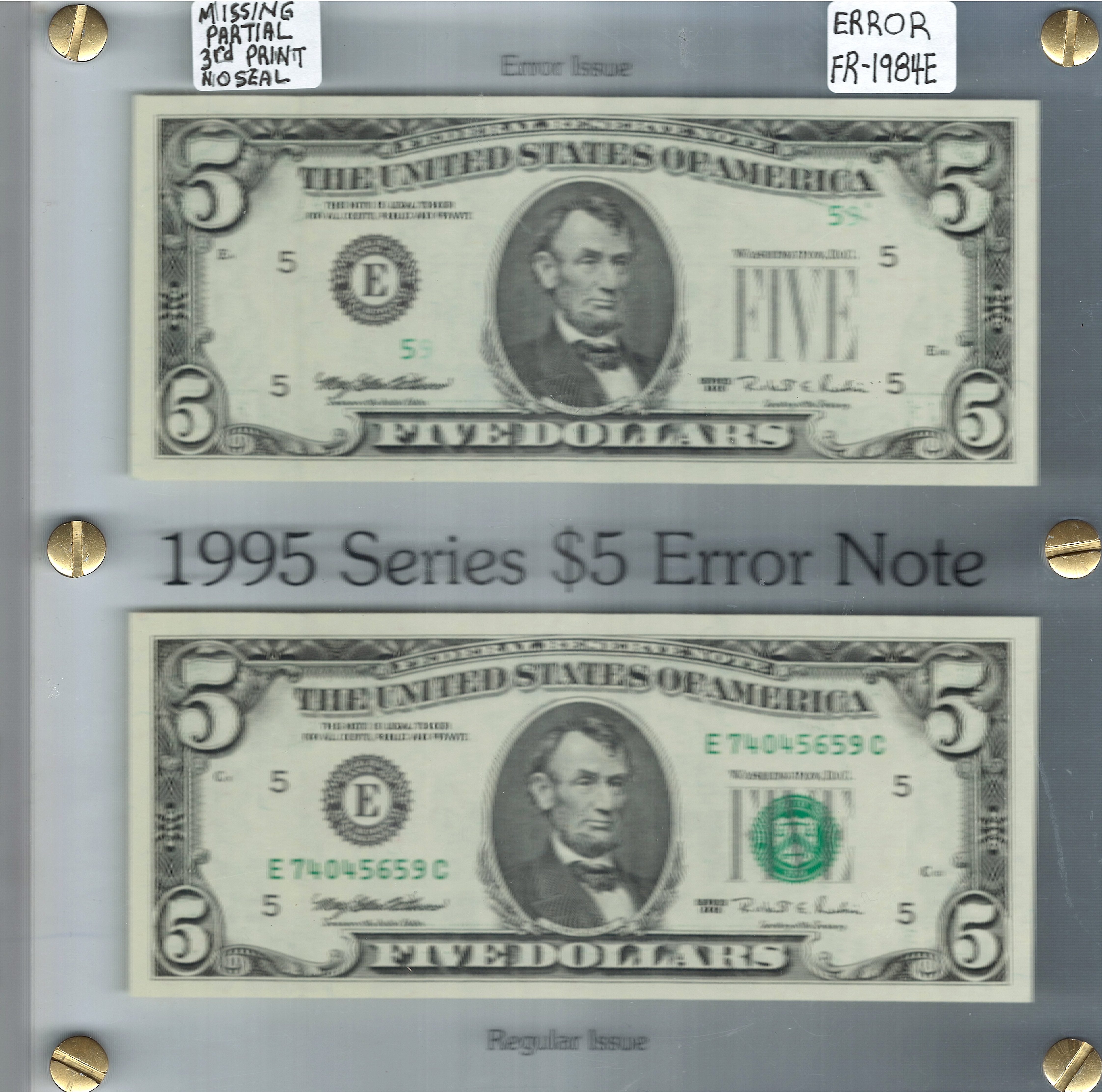Fr.-1894 1984 $5 Error Note Missing Partial 3rd Print (No Seal or Serial no)