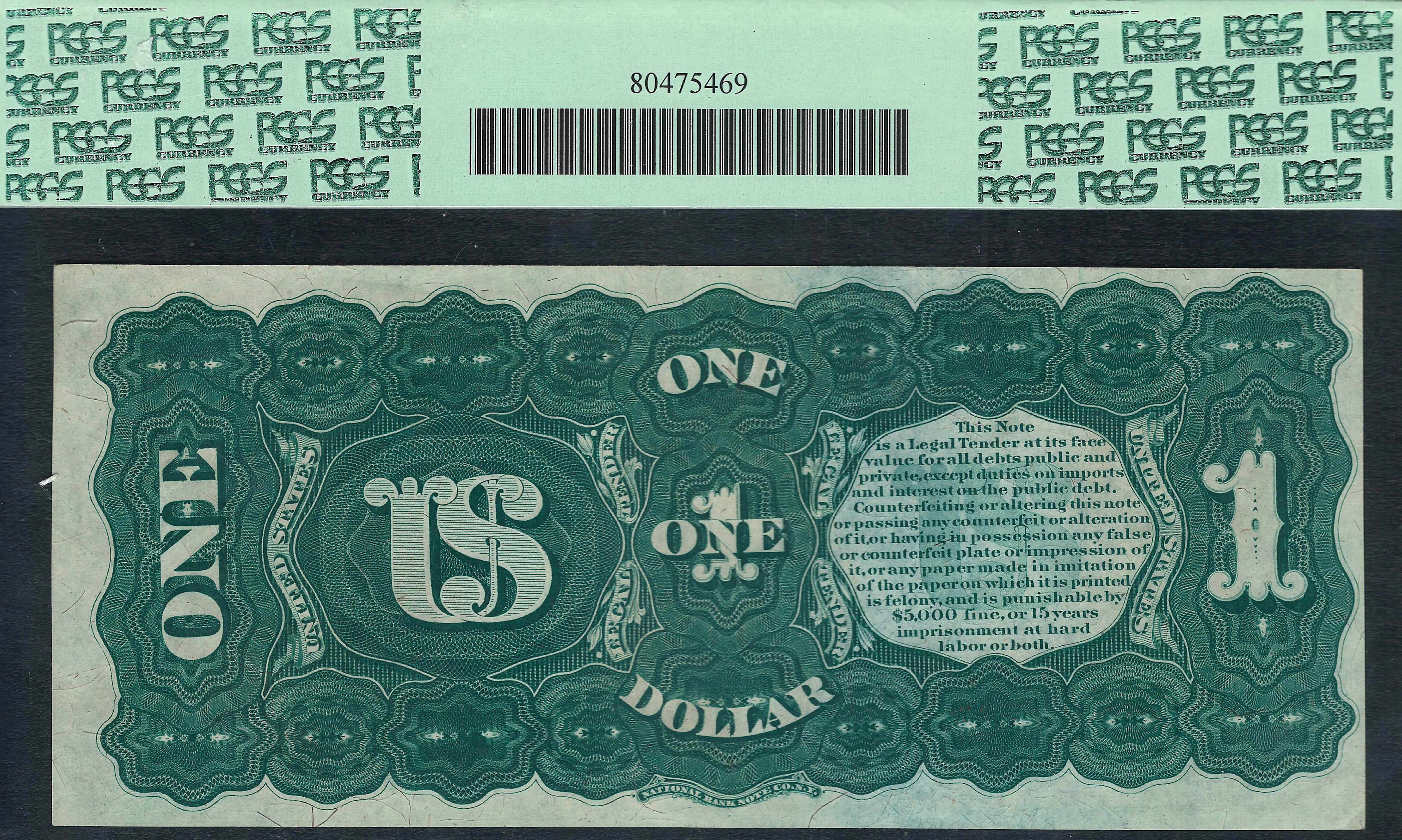 This is the famous 1869 $1 Legal Tender commonly referred to as the Rainbow Note. It received its name because of the beautiful Rainbow Colors across the face. The face features a portrait of President George Washington in the center and a vignette of Columbus landing in America to the left side. On the bottom right is the popular large red spiked seal. A view of the back will display the workmanship of what our currency used to look like. FYI...On the face you will notice the top margin appears to be off from left to right.If you will LOOK CLOSELY you will notice that is not the case. The rainbow coloring is running into the margins at the left top. Your just getting extra coloring. Follow the black top border and you will see that it is even all the way across the top. Remember these 4 subject sheets were hand cut back in 1869. The serial number is V2863828 and it is in a PCGS-58PPQ holder. The last 1869 $1 Rainbow in a PCGS-58PPQ holder to sell was in a Heritage auction on 4/23/2014 and sold for $3055.
