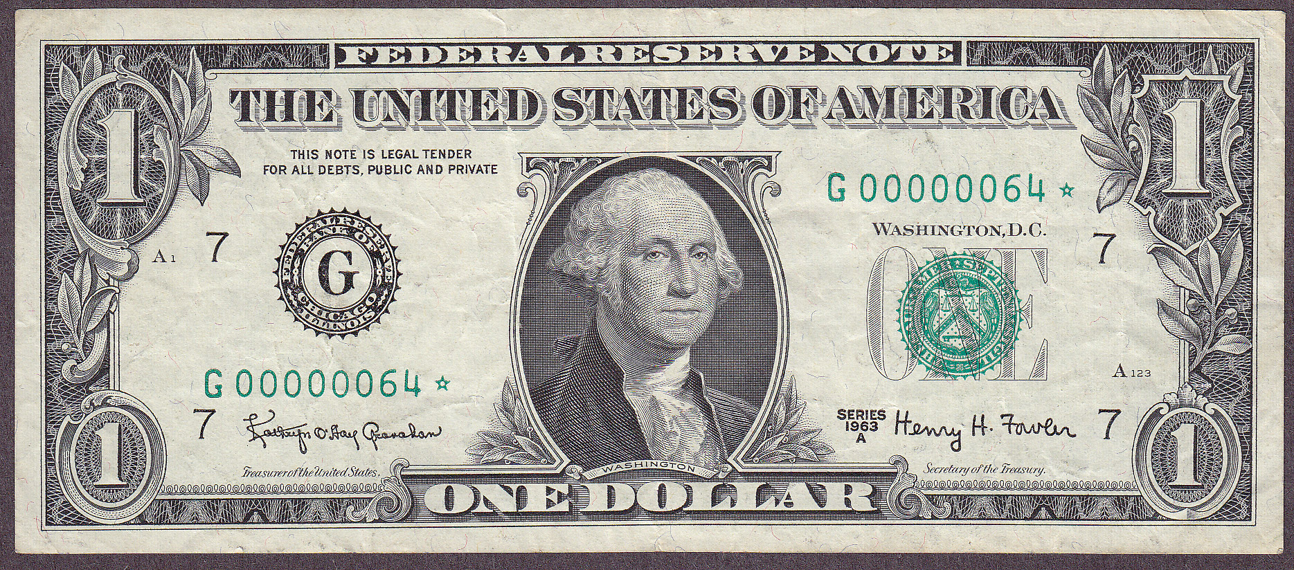 Here is a 1963A $1 FRN star from the Chicago district. It features broadwalk margins and a fancy serial number of G00000064*. There are no rips, tears, pinholes or bank marks. Check the large scans and you will see that is is in wonderful condition, never pressed or cleaned.
