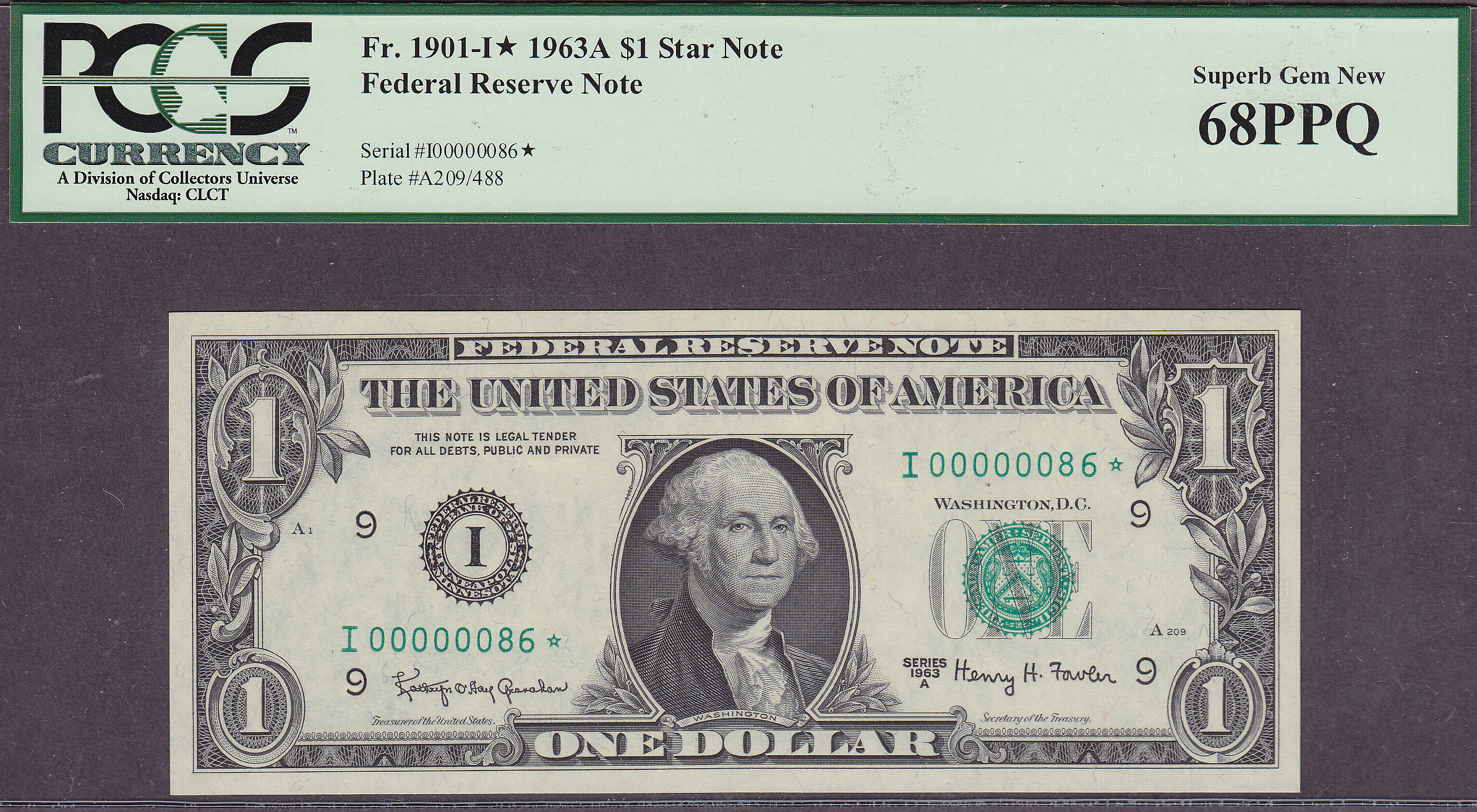 This is the only note I have ever received or seen from PCGS in a Superb GEM NEW 68PPQ holder, other than a new modern colorized note. You never see any of their small size notes in a 68PPQ holder, unless its a new modern colorized note. This is a 1963A $1 Federal Reserve Note. The low two-digit serial number is I00000086*. How cool is this?