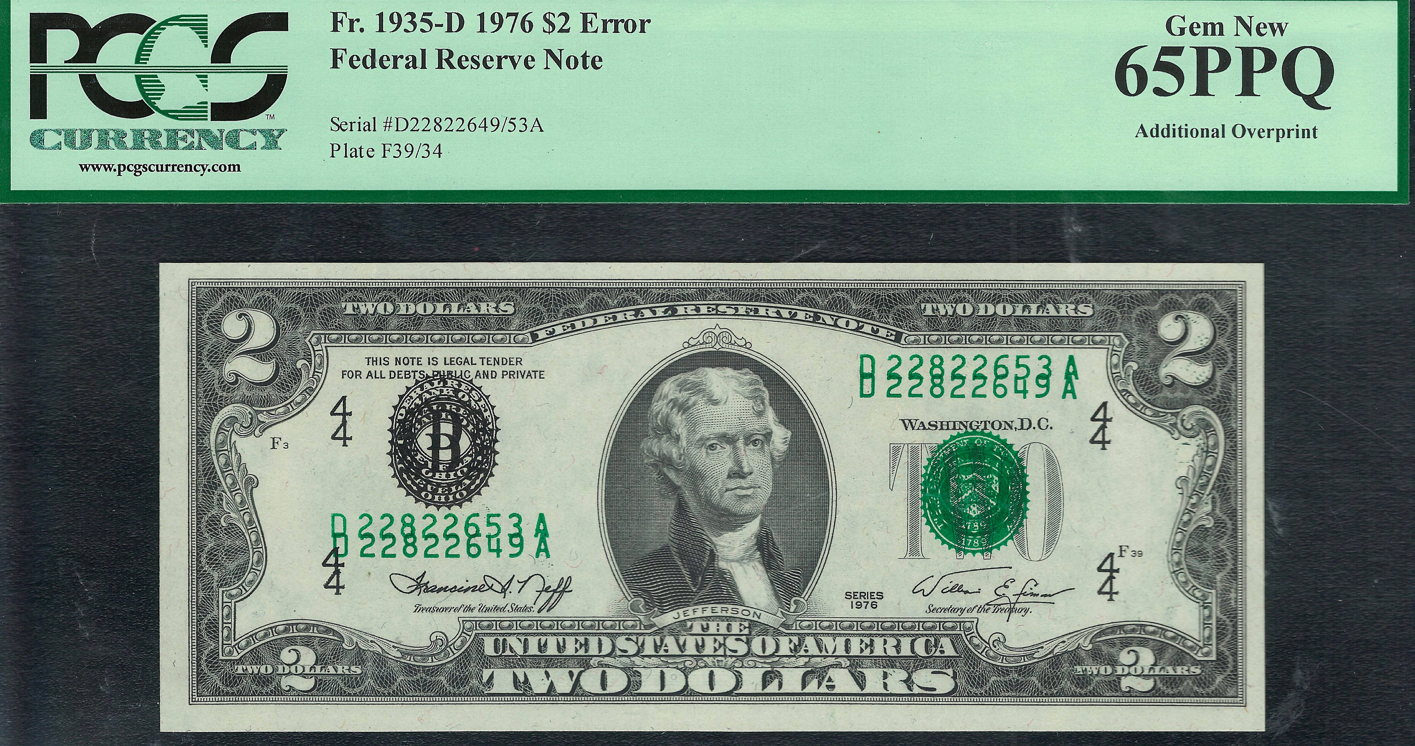 I have owned several examples of this error type over the years. Earlier this year I sold my PCGS-64PPQ example. This is the second time I have owned a GEM-65PPQ example. The last one in a GEM-65PPQ I sold for $22,500 to a coin dealer for his client several years ago in Baltimore. If you are a advanced collector or simply want to own of the most prestigious and pedigreed errors of all time, here is your one chance to get a GEM example. . The serial numbers are D22822649A and D22822653A and it is housed in a GEM PCGS-65PPQ holder.