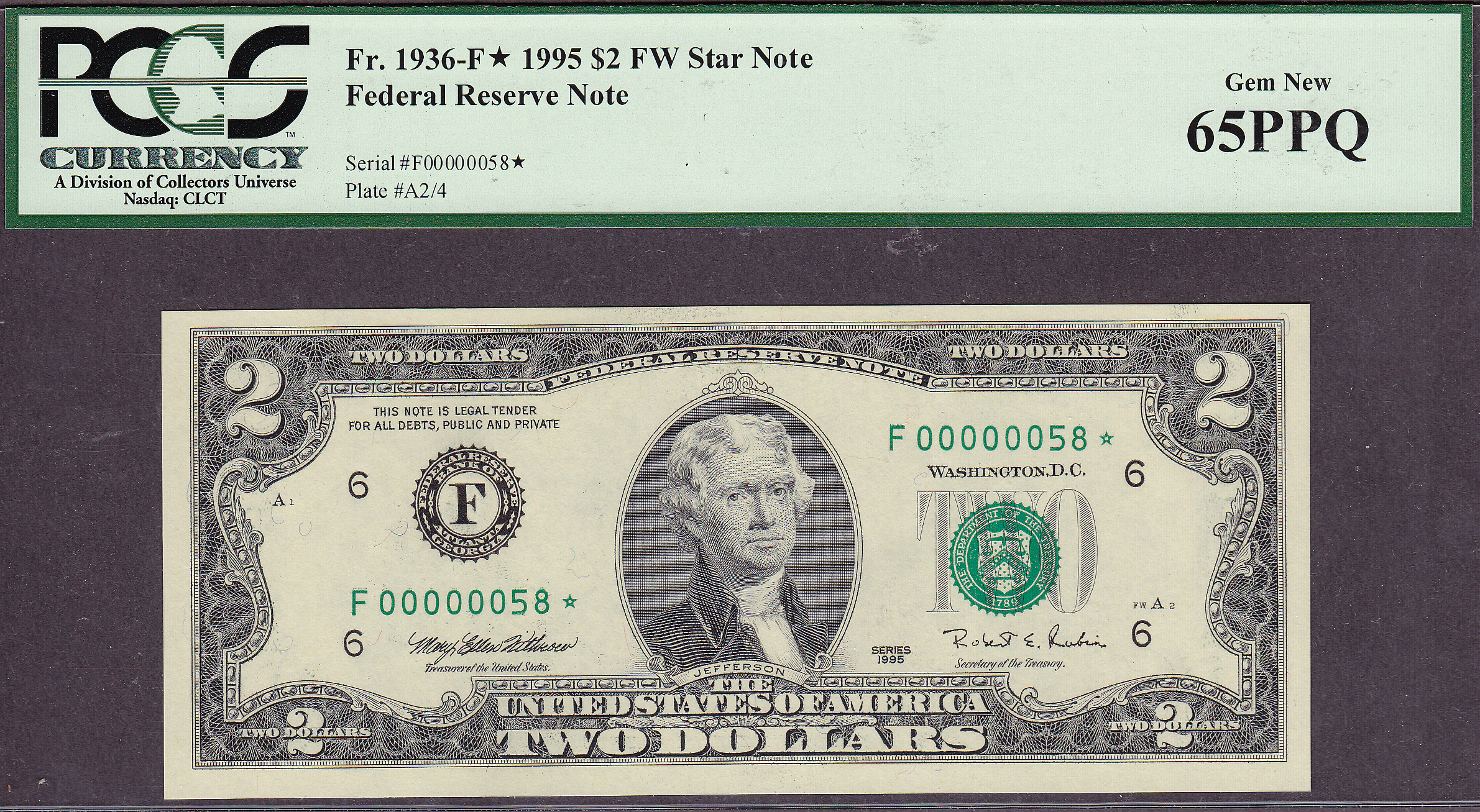 This note is part of a large collection of single and double digit 1995 $2 stars. All of them are graded by PMG or PCGS and most are in grades from 65 to 67EPQ or PPQ. If you have a favorite serial number you collect ot want a two digit $2 star for you birthday age or year, this is your chance to get one. Check out all of the numbers. Im offering all of them below my cost so you might want to take advantage of this sale.