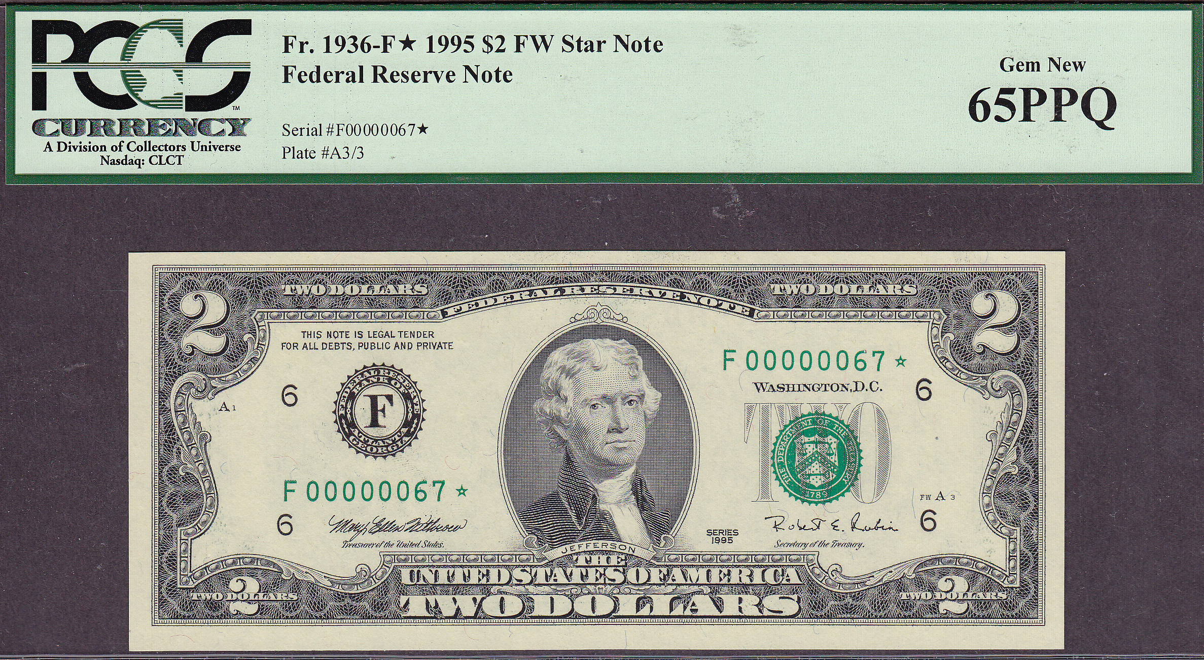 This note is part of a large collection of single and double digit 1995 $2 stars. All of them are graded by PMG or PCGS and most are in grades from 65 to 67EPQ or PPQ. If you have a favorite serial number you collect ot want a two digit $2 star for you birthday age or year, this is your chance to get one. Check out all of the numbers. Im offering all of them below my cost so you might want to take advantage of this sale.