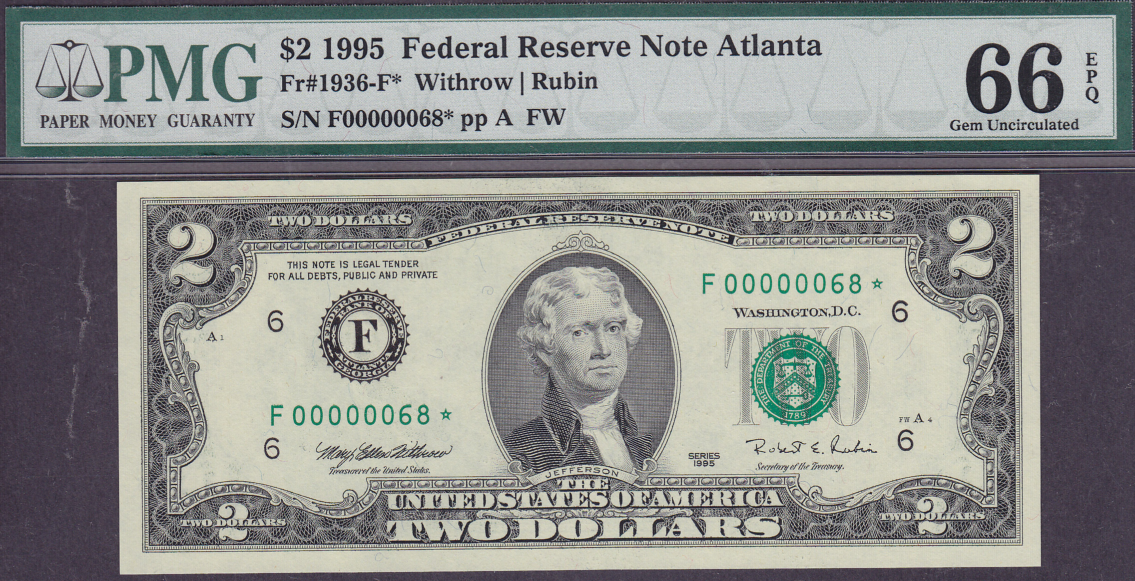 This note is part of a large collection of single and double digit 1995 $2 stars. All of them are graded by PMG or PCGS and most are in grades from 65 to 67EPQ or PPQ. If you have a favorite serial number you collect ot want a two digit $2 star for you birthday age or year, this is your chance to get one. Check out all of the numbers. Im offering all of them below my cost so you might want to take advantage of this sale.