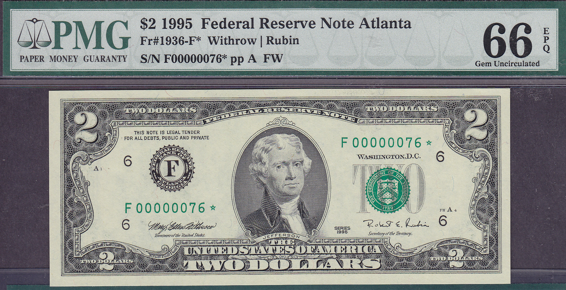 Fr.-1936* 1995 $2 Atlanta Ser. FD00000076* PMG-66EPQ