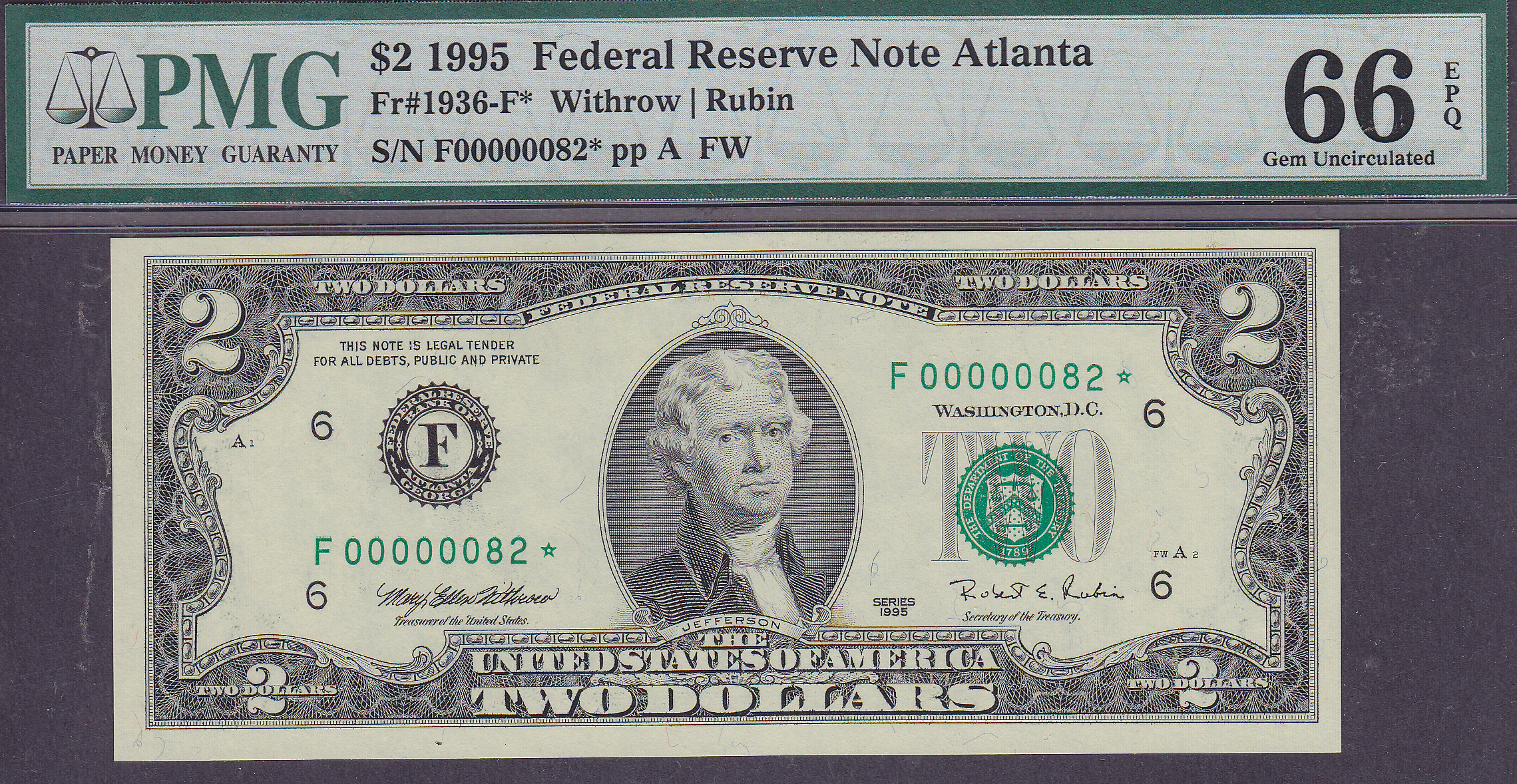 This note is part of a large collection of single and double digit 1995 $2 stars. All of them are graded by PMG or PCGS and most are in grades from 65 to 67EPQ or PPQ. If you have a favorite serial number you collect ot want a two digit $2 star for you birthday age or year, this is your chance to get one. Check out all of the numbers. Im offering all of them below my cost so you might want to take advantage of this sale.