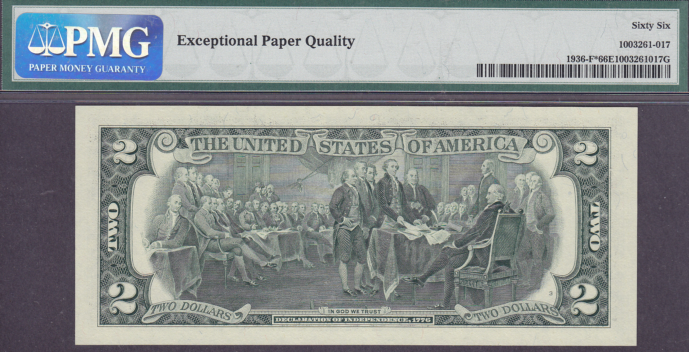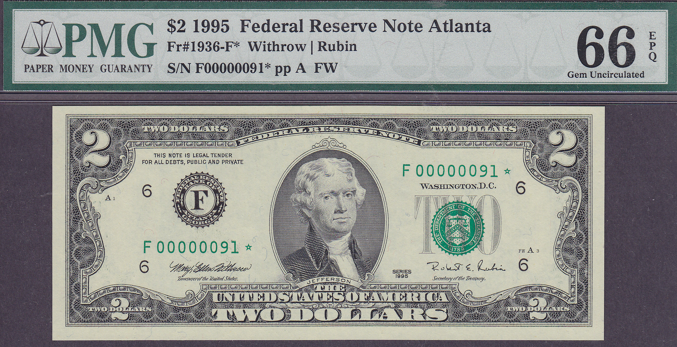 This note is part of a large collection of single and double digit 1995 $2 stars. All of them are graded by PMG or PCGS and most are in grades from 65 to 67EPQ or PPQ. If you have a favorite serial number you collect ot want a two digit $2 star for you birthday age or year, this is your chance to get one. Check out all of the numbers. Im offering all of them below my cost so you might want to take advantage of this sale.
