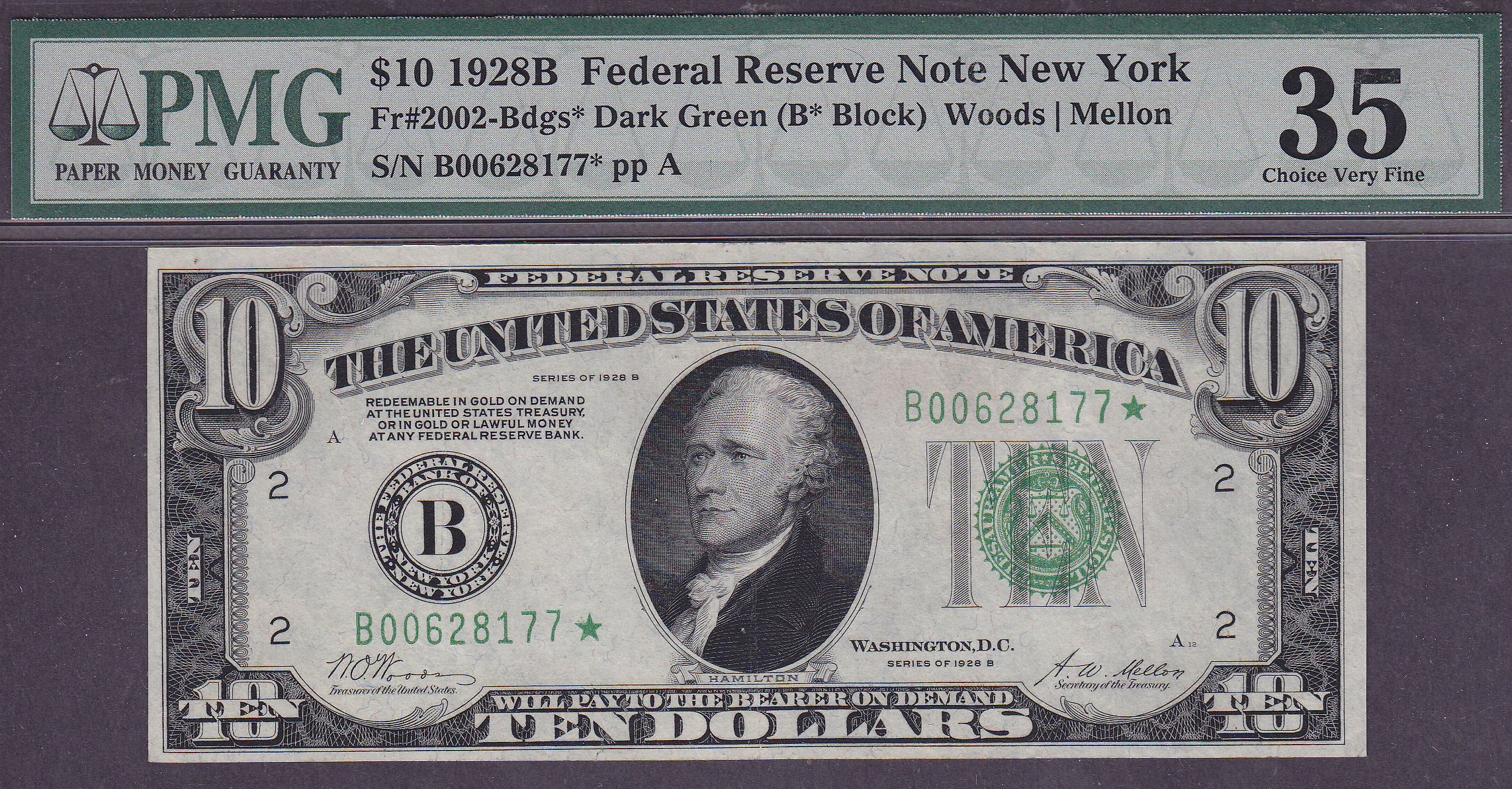 Here is a nice 1928B* Dark green seal star with power white paper. The serial number is B00628177* and it is in a PMG VF-35 holder. The plate # is A12/122. No rips, tears or pinholes. All 1928 notes are very tought to find, especially stars.
