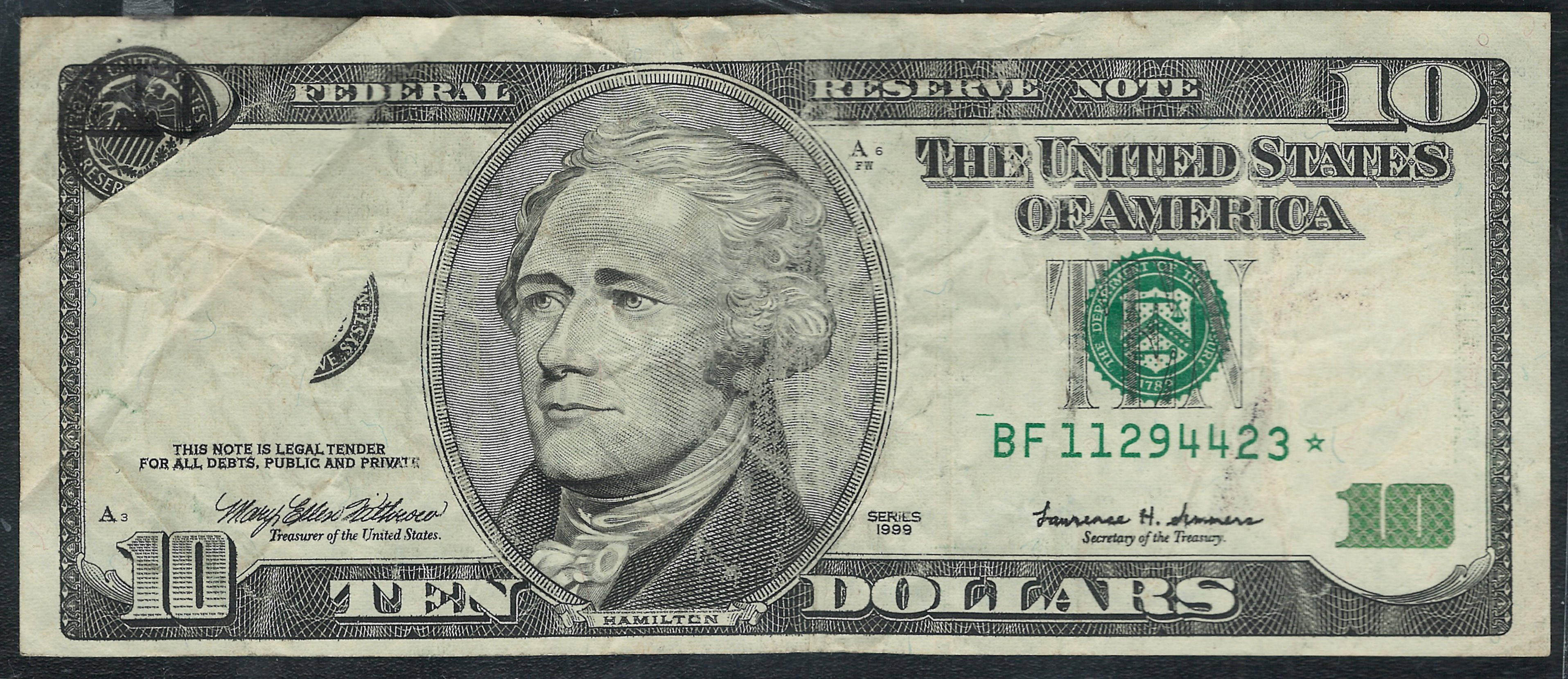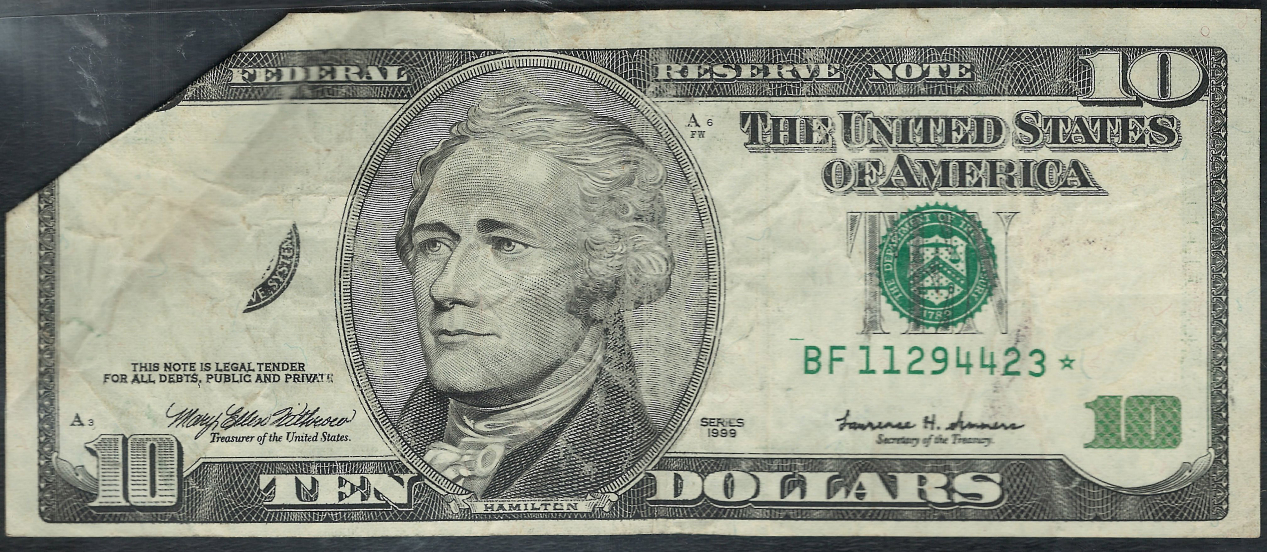 Fr.-2034 1999 $10 STAR fold over Error Note Fold Ser. FBF11294423 VF plus