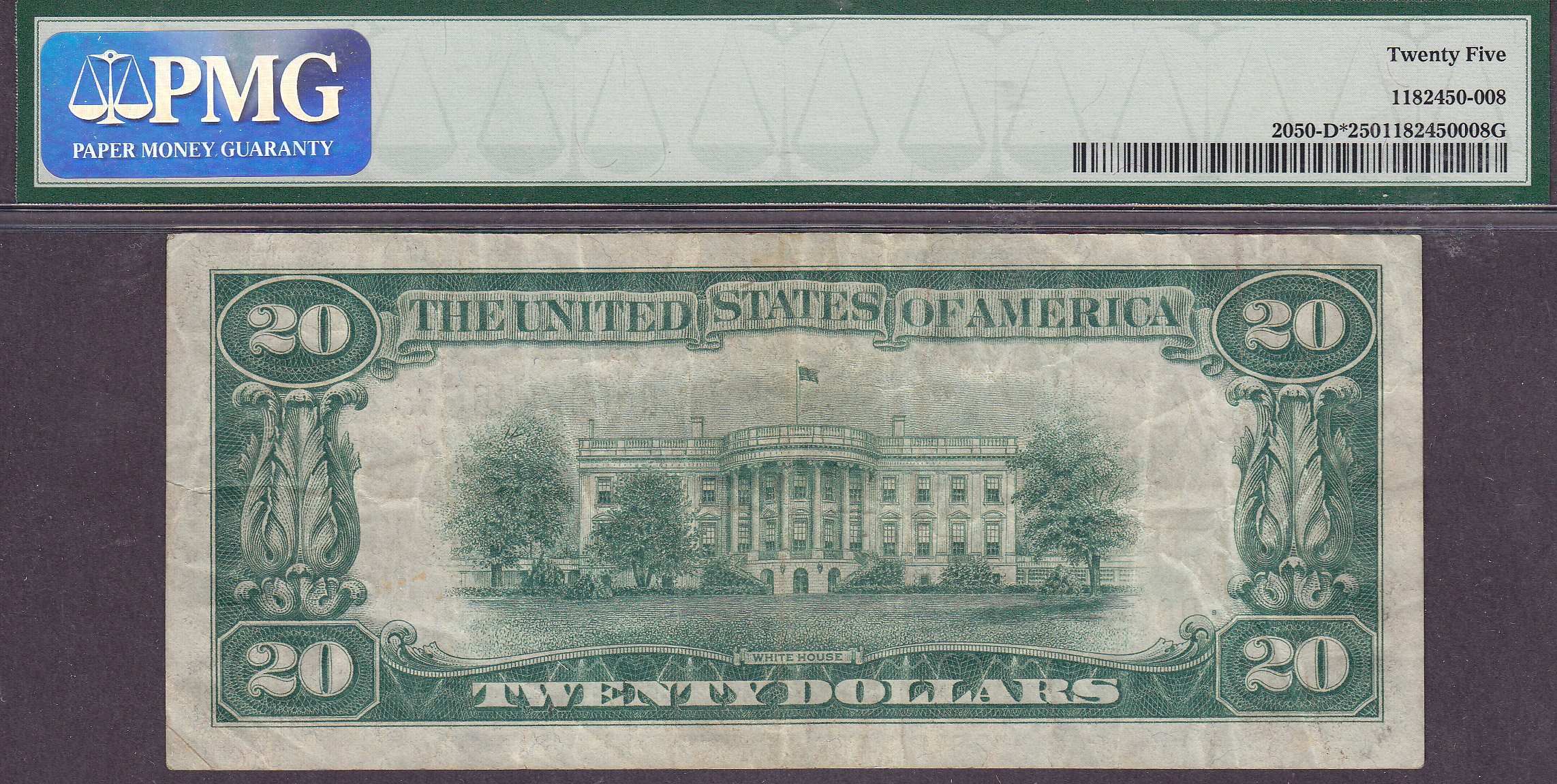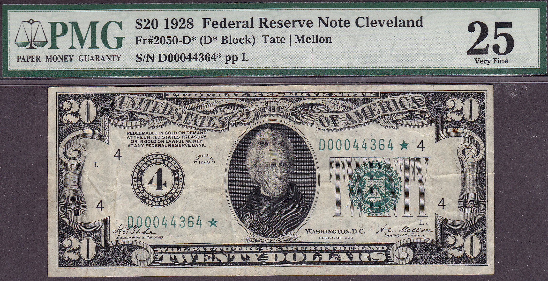 Here is a 1928 Cleveland $20 Star note in a problem free PMG VF-25 holder. The serial number is D00044364*. This note list for almost $2,000 in UNC.