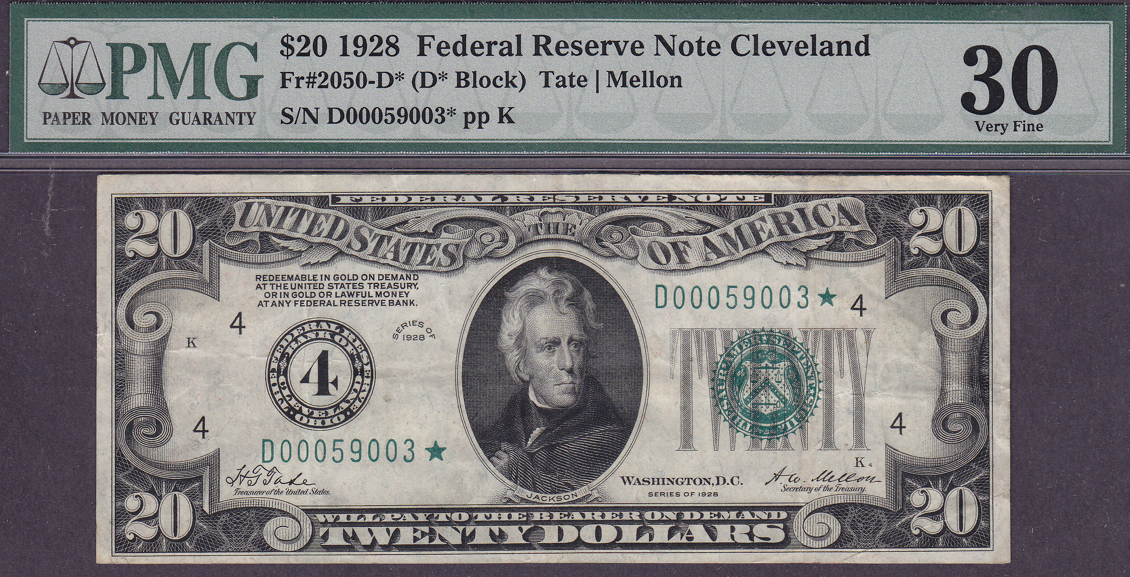 This is a real nice 1928 $20 FRN star from Cleveland, OH. The serial number is D00059003*. It is in a PMG VF-30 holder. The plate numbers are K4/6. There are no rips. tears or pinholes.