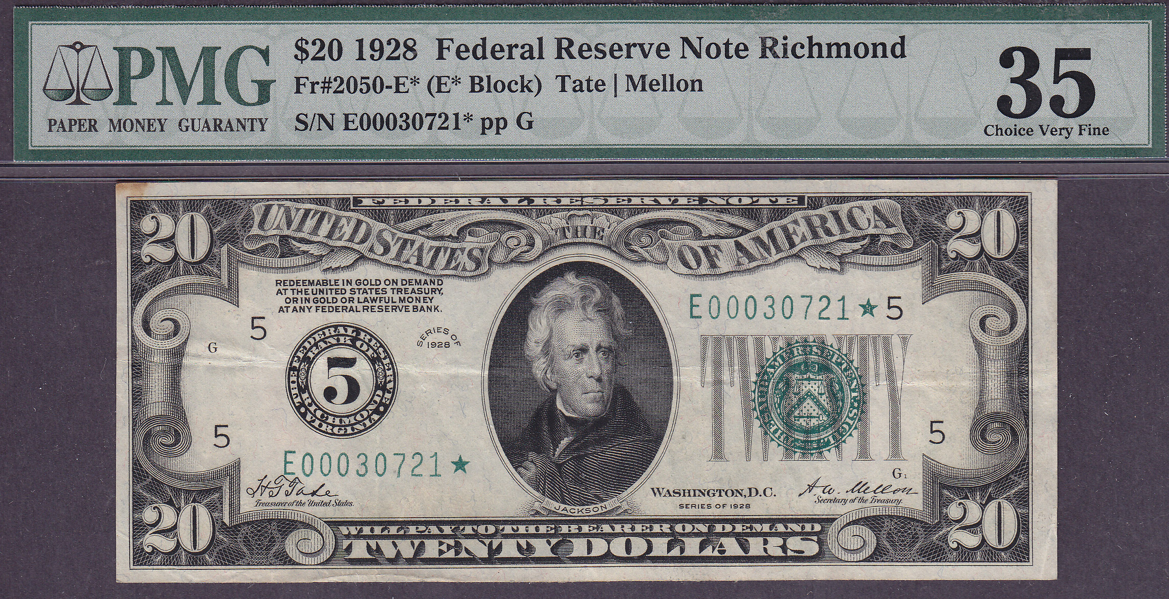 Fr.-2050* 1928 $20 Richmond Ser. E00030721* PMG VF-35