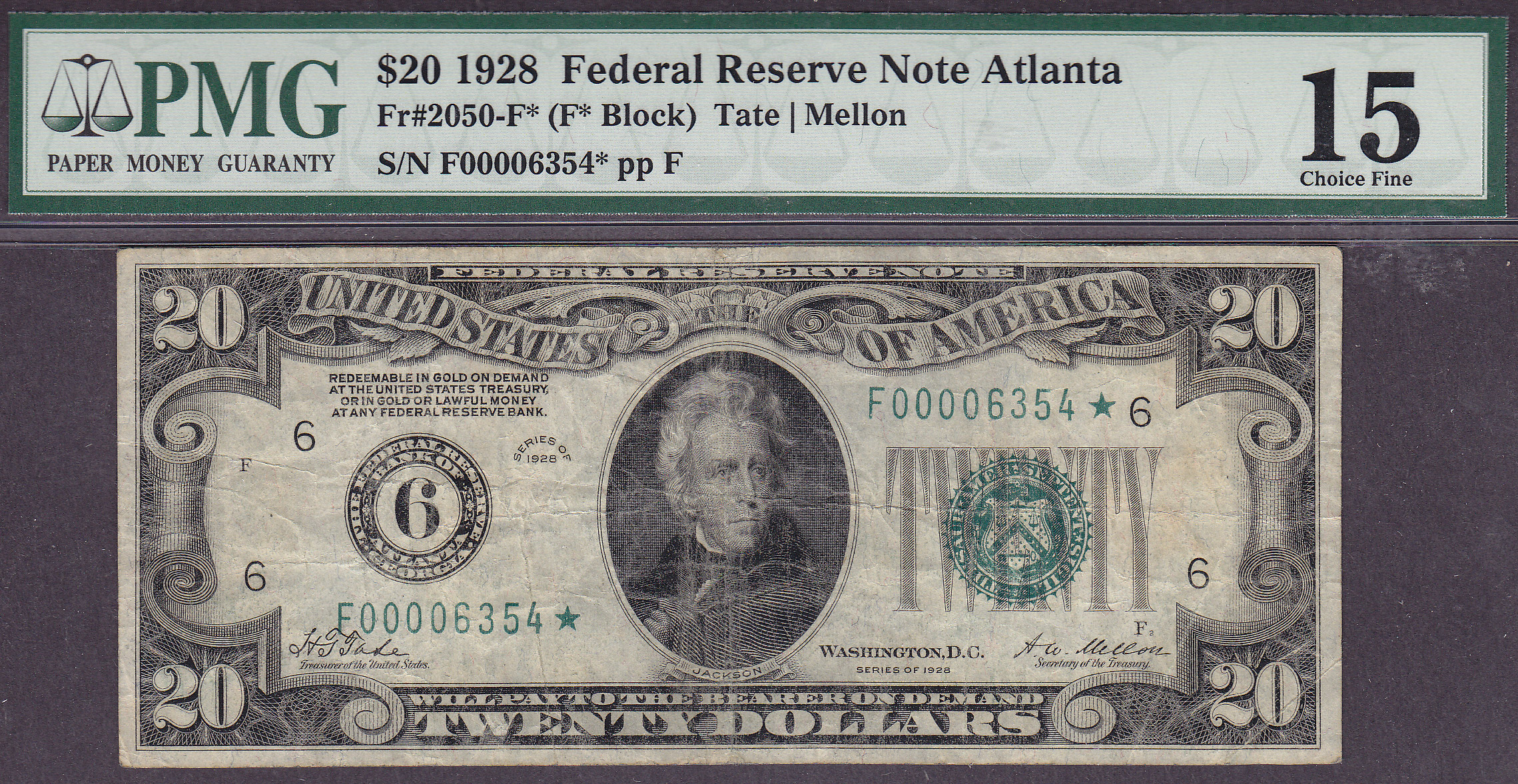 Here is another scarce 1928 $20 FRN Star from the tough Atlanta district. There were only 76,000 printed and even fewer releaded. It is in a PMG F-15 holder. The serial number is F00006354*. No rips, tears or pinholes.