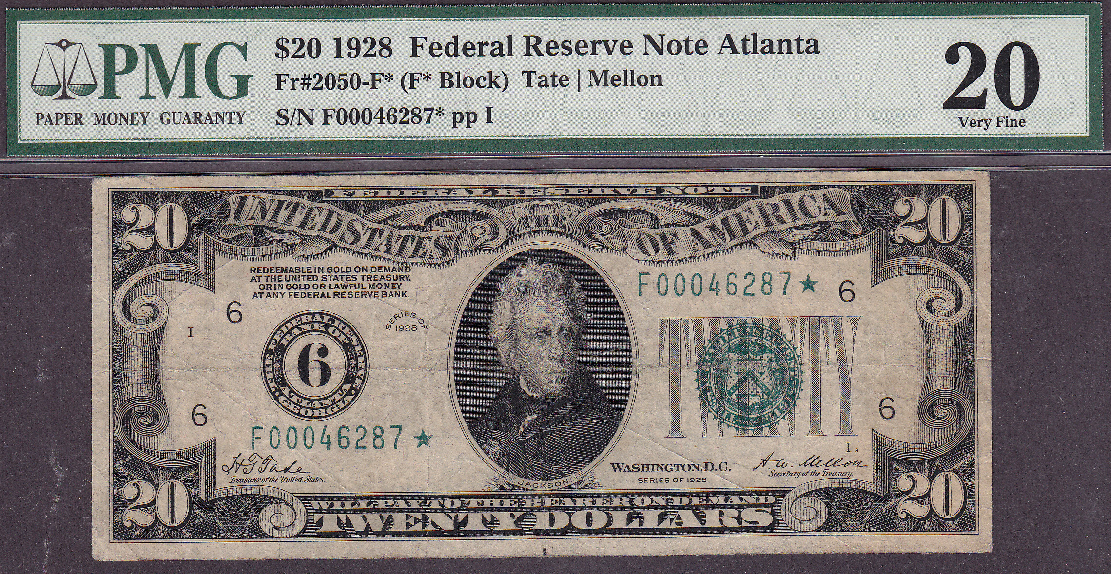 Here is a very nice and problem free 1928 $20 Atlanta star note. It is in a PMG VF-20 holder. The serial number is F00046287*.
