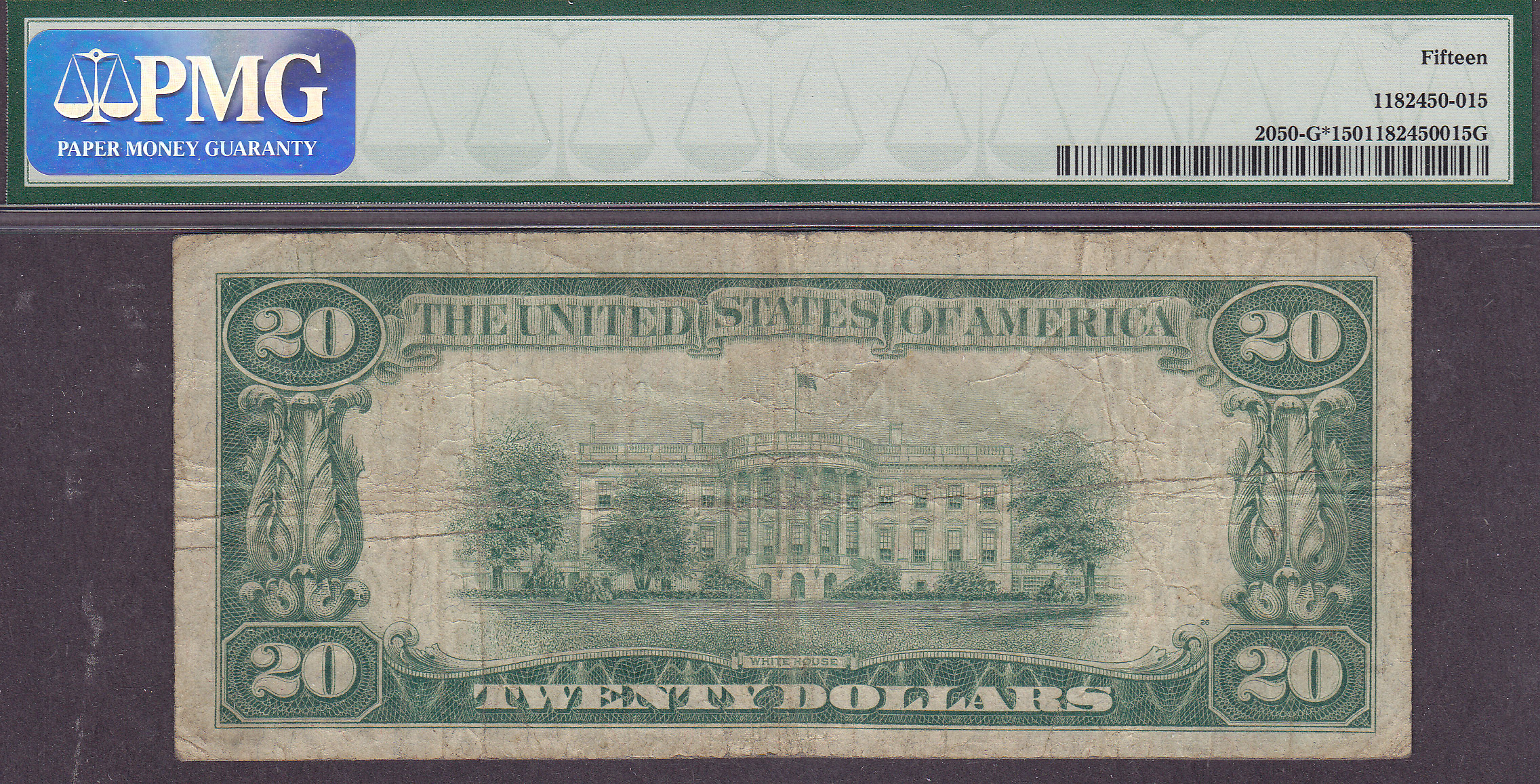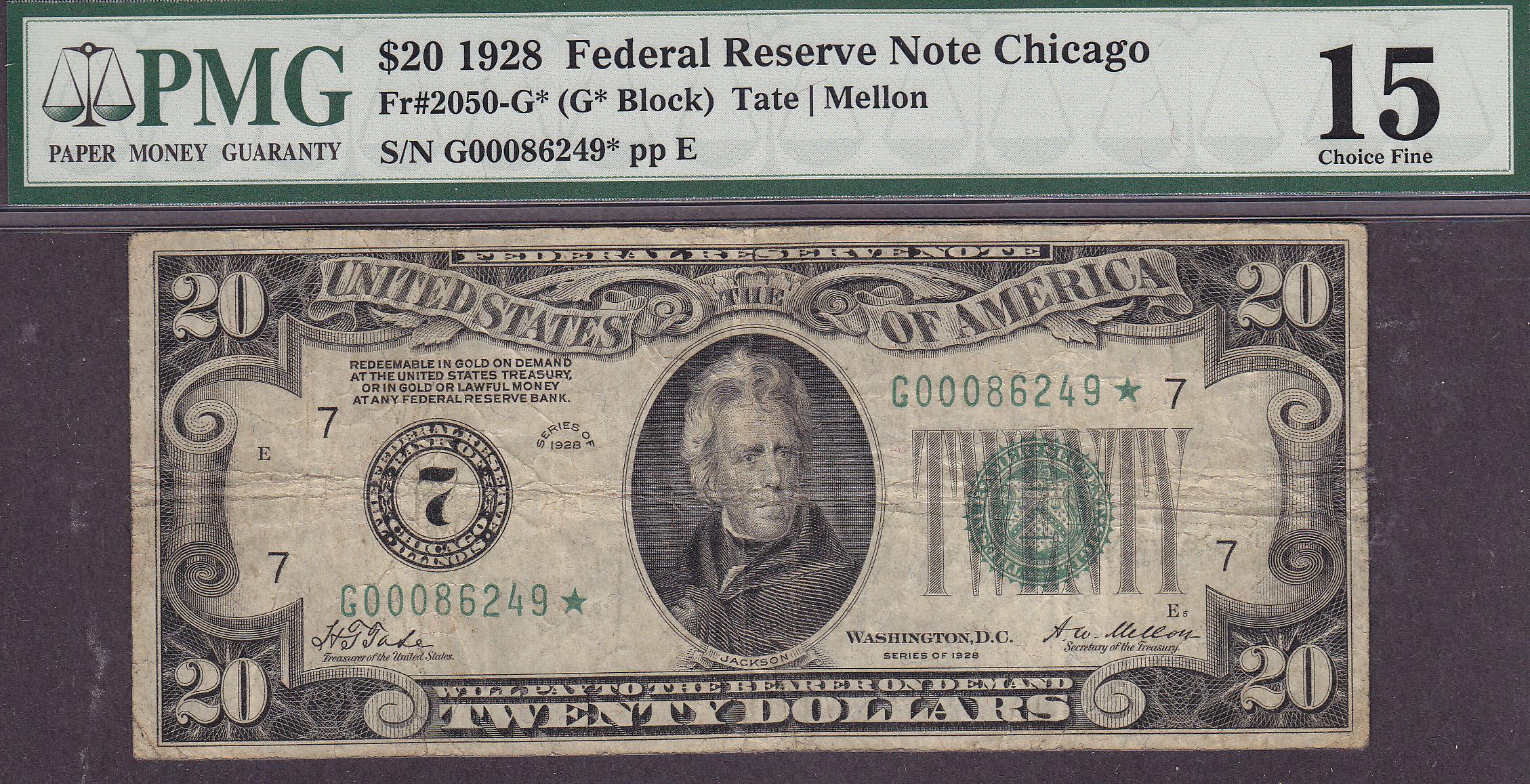 Here is a 1928 $20 FRN STAR from the Chicago District. The serial number is G00086249*. It is in a PMG-15 holder. There are no rips, tears or pinholes.