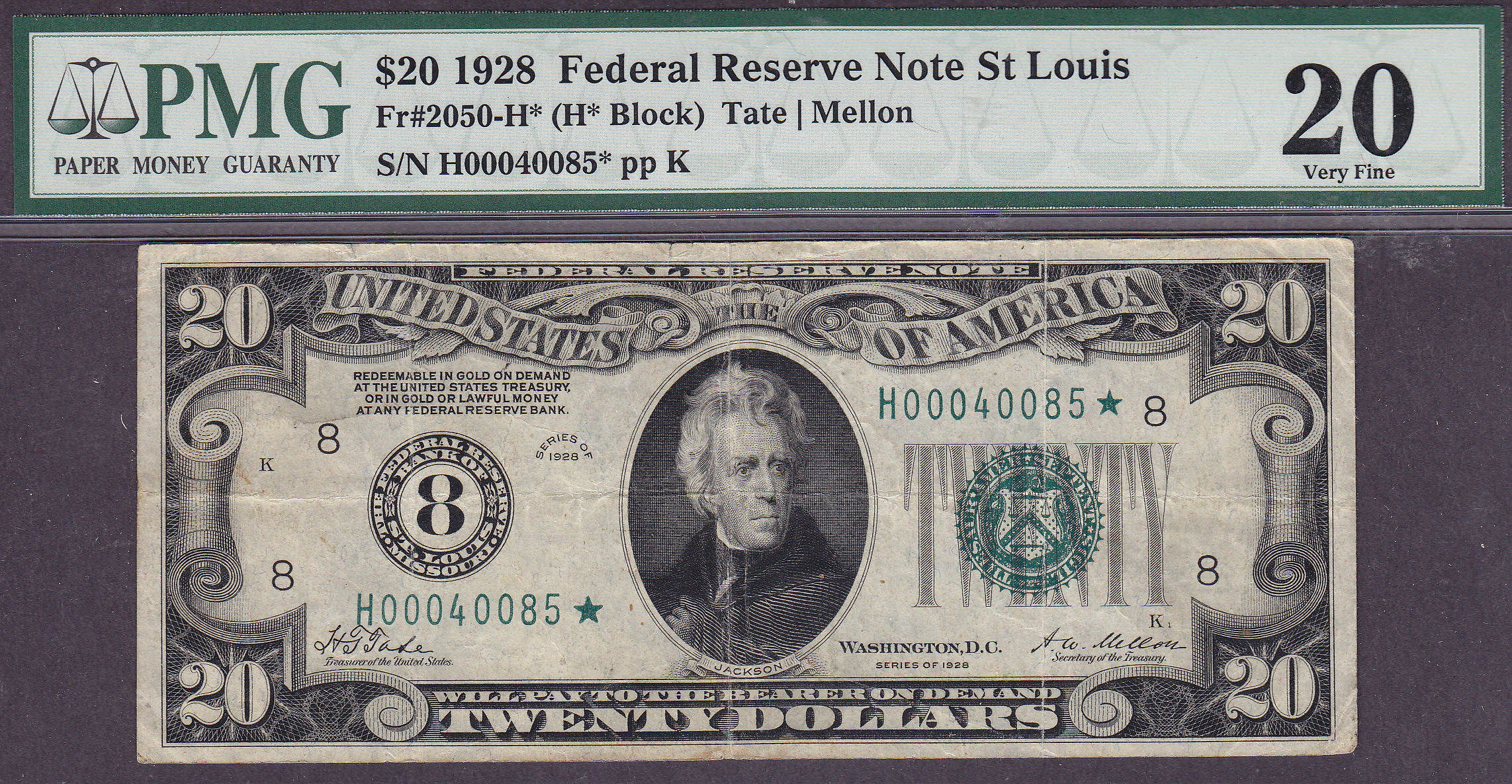 This is a nice 1928 $20 FRN STAR from the St Louis Distric. It is in a under graded PMG VF-20 Holder. The serial number is H00040085*.