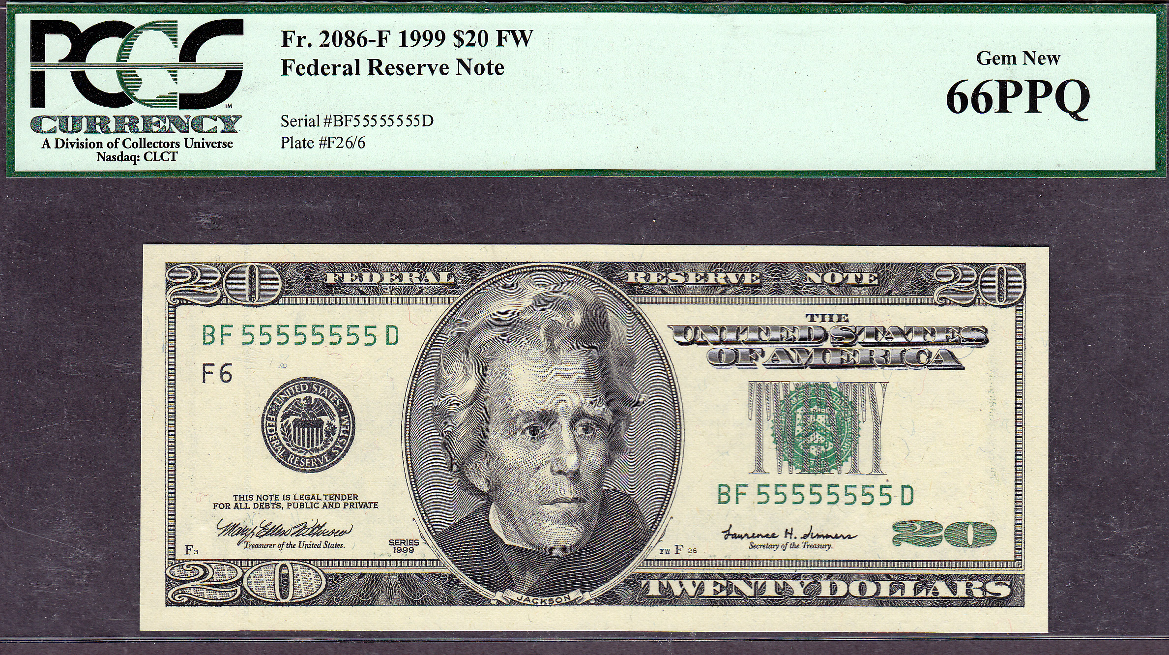 This is a real nice 1999 $20 FRN from the BEP plant in Ft Worth, Texas. It has the solid five serial number of BF5555555D in a PCGS-66PPQ holder. It has been graded as a PCGS-66PPQ. It doesn't get much better than this. A great note for playing liars poker with your ex friends.