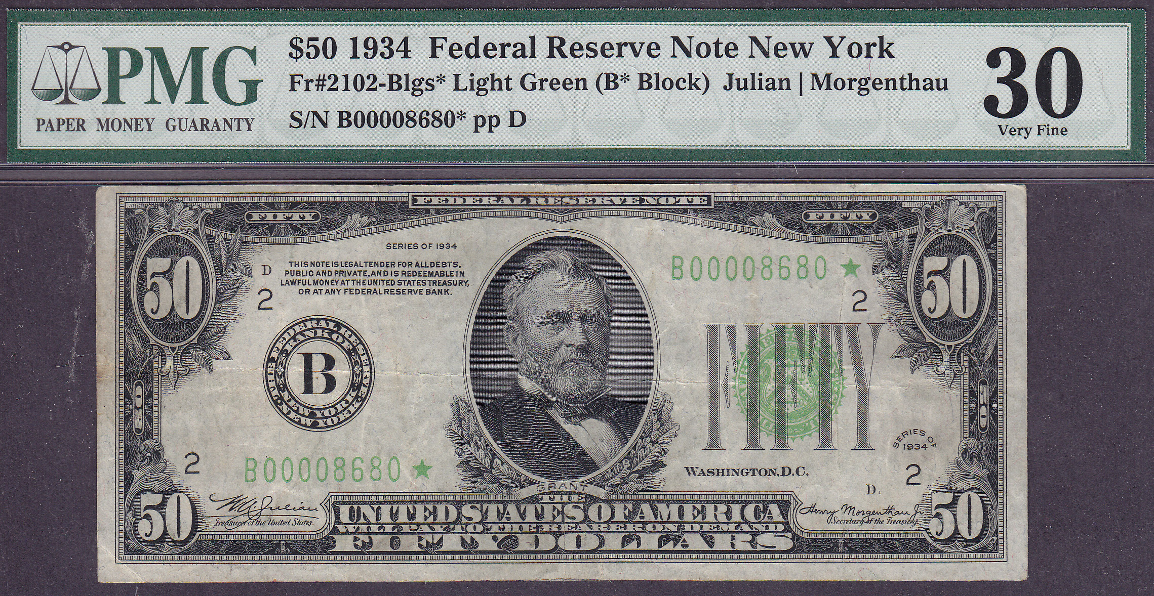 Here is a 1934 $50 New York FRN Star with the Light Green seal. The serial number is B00008680* and it is in a PMG VF-30 holder. This note was formally in a CGA EF-40 holder.