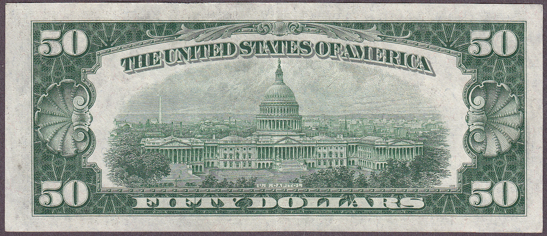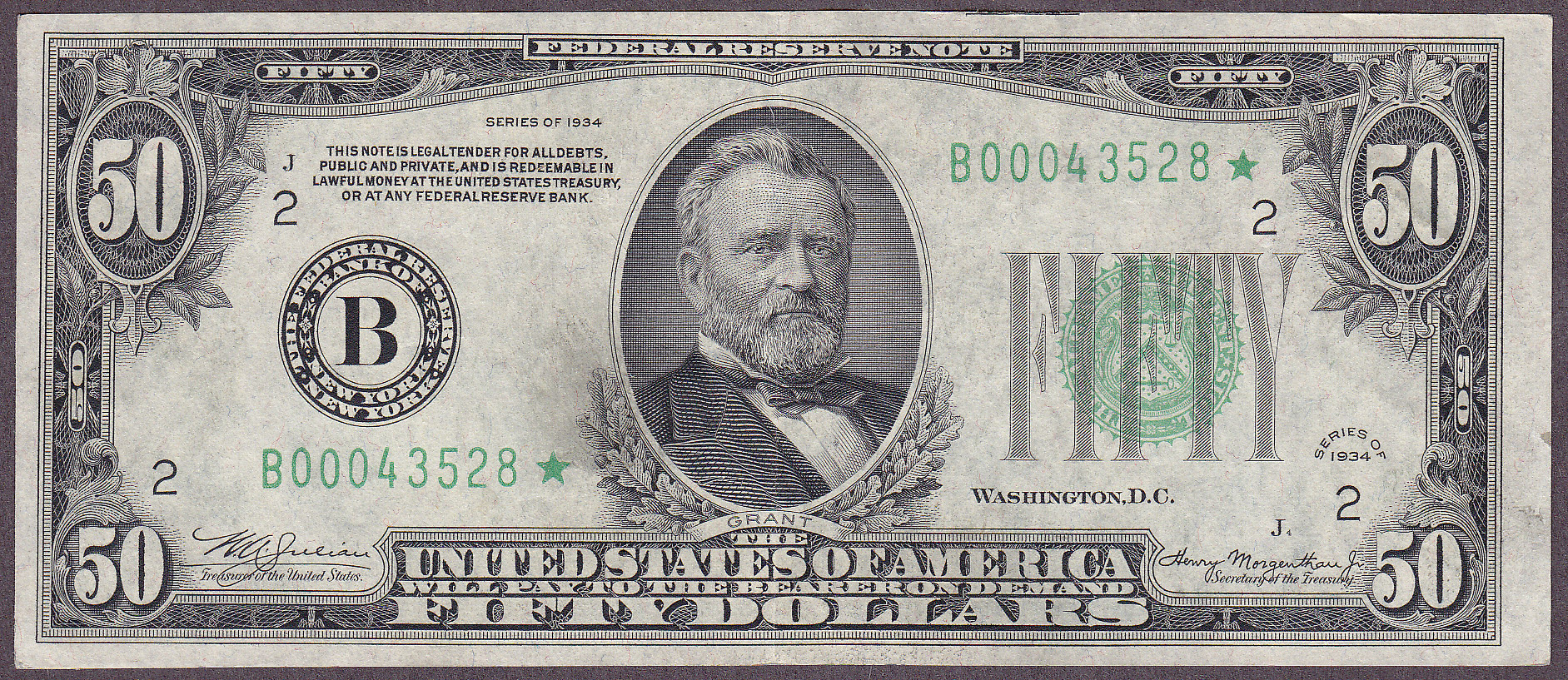 This is a nice 1934 $50 FRN Star from the New York District. The serial nuymber is B00043528*. There are no rips, tears or pinholes. Decent margins and nice color. Never cleaner or pressed.