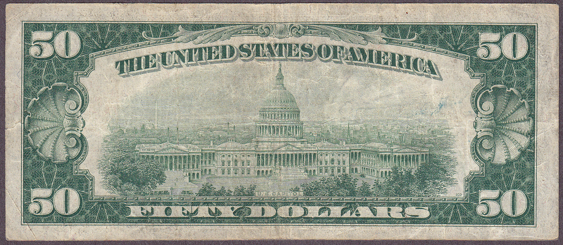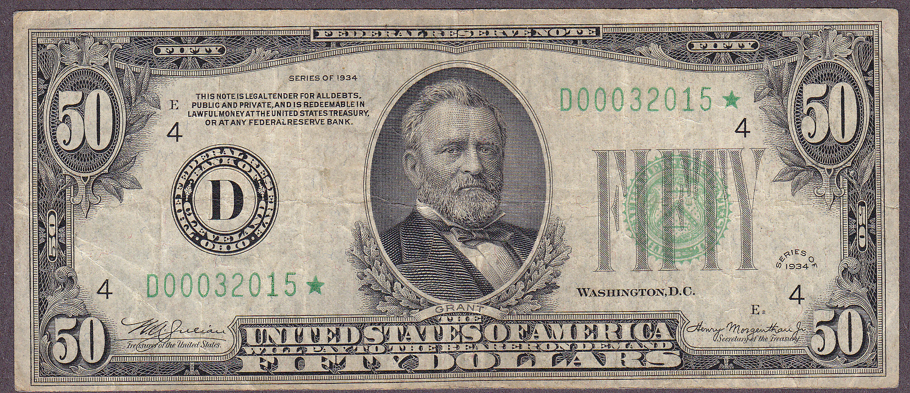 This is a 1934 $50 FRN from Cleveland. It is a Dark Green Seal Star with the Ser. number of D00032015*. This VF note has no rips, tears or pinholes. The serial number is D00032015*.