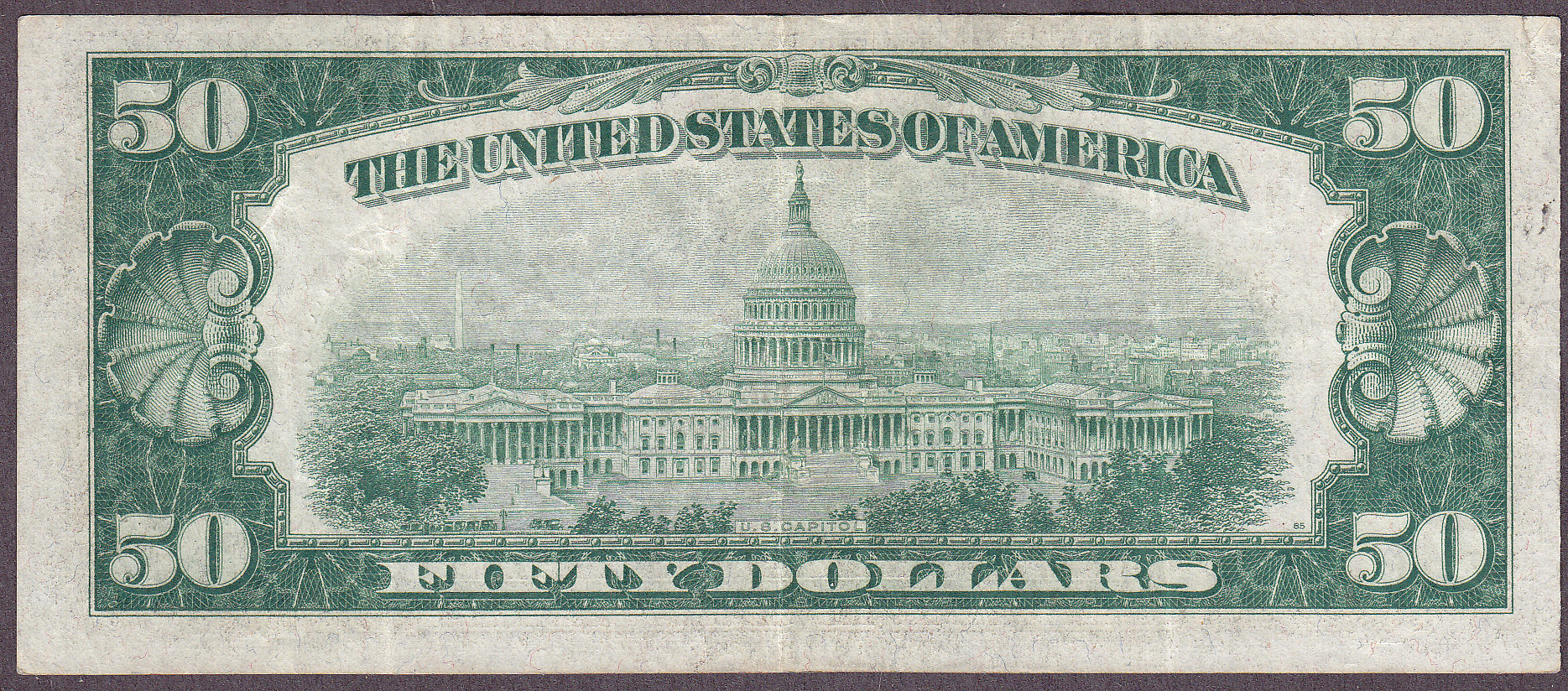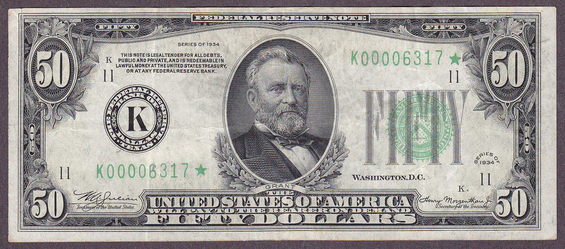 This is a very scarce 1934 $50 FRN Star from the ever tough and popular Dallas District. The low four-digit serial number is K00006317*. There are no heavy folds m arks or pinholes. All original with nice margins and dark green serial numbers and seal. A real treasure. There is a small rip at the top left margin that does not distract from the note. It is still a very rare Dallas star note.