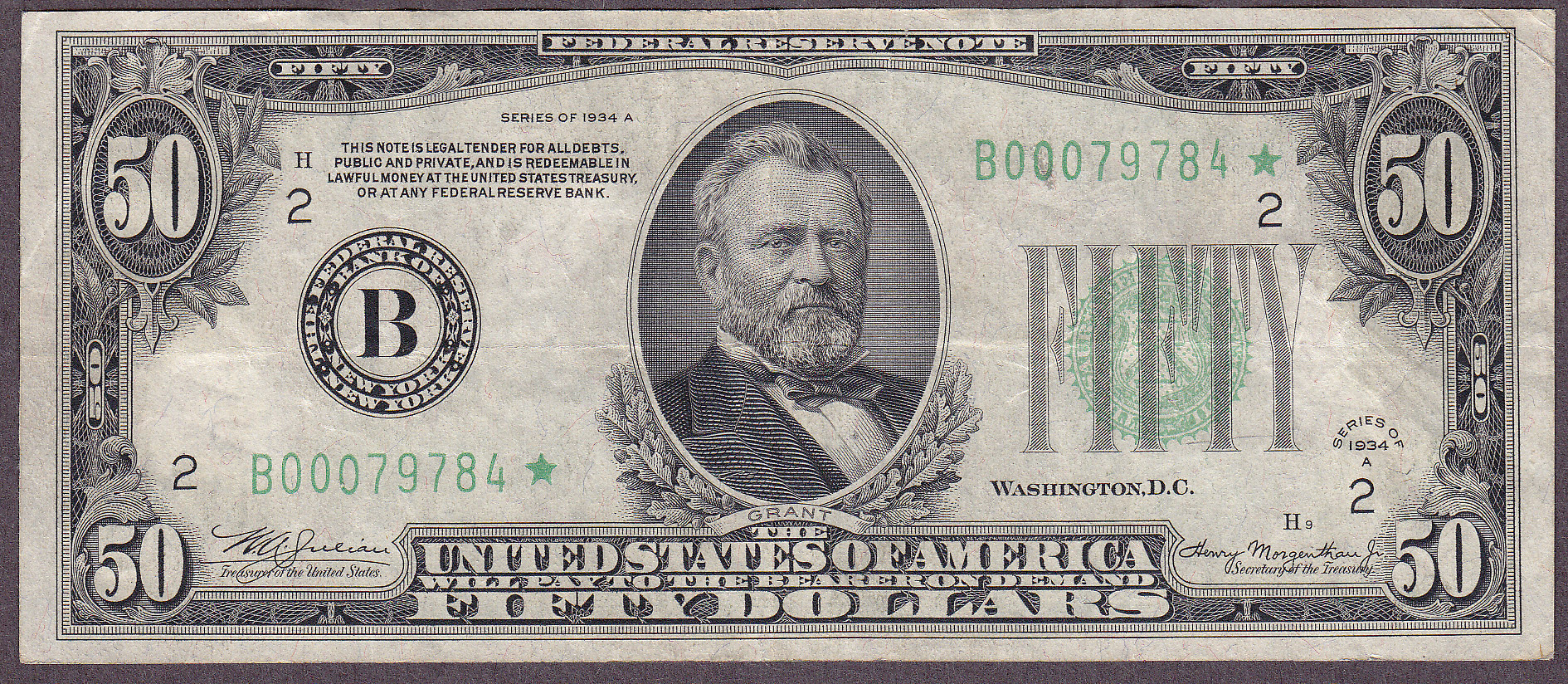 This is a very nice Extra Fine no problem 1934A $50 FRN Mule Star from the New York District. The serial number is B00079784*. There are no rips, tears or pinholes, it is all original. Check out the large scans.