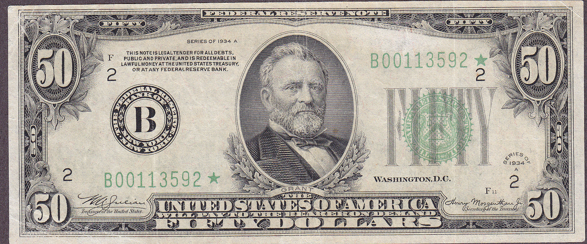This is a very nice Extra Fine/ Almost Uncirculated no problem 1934A $50 FRN Mule Star from the New York District. The serial number is B00113592*. There are no rips, tears or pinholes, it is all original. Check out the large scans.