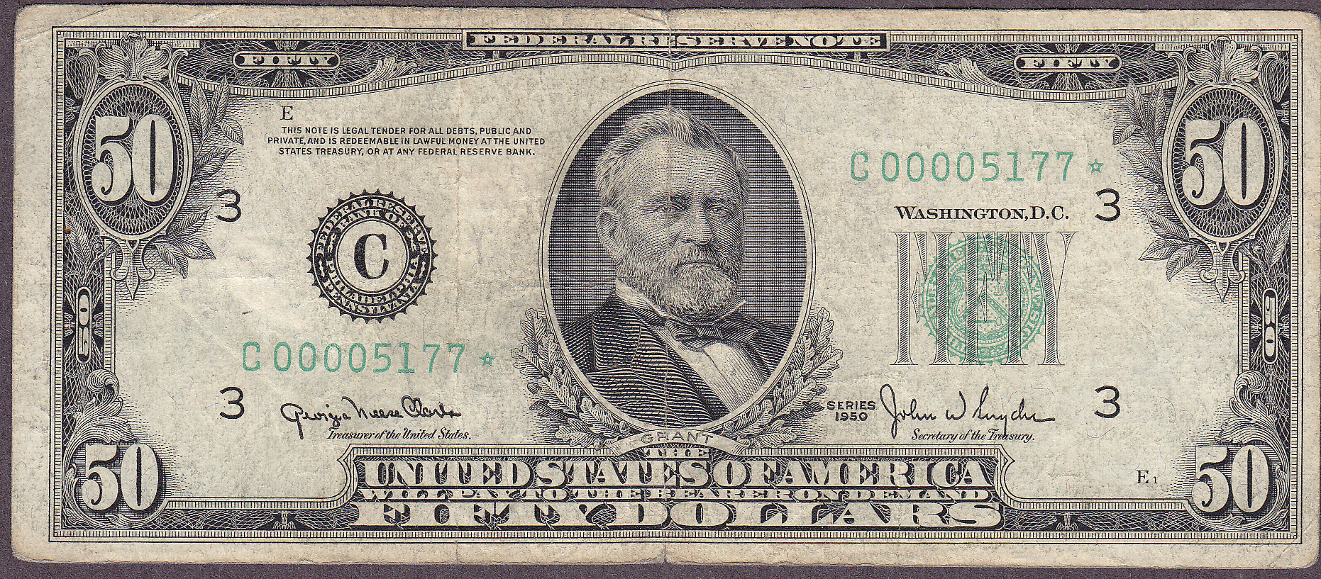 Fr.-2107C* 1950 $50 Philadelphia Star FRN Ser. C00005177* VF