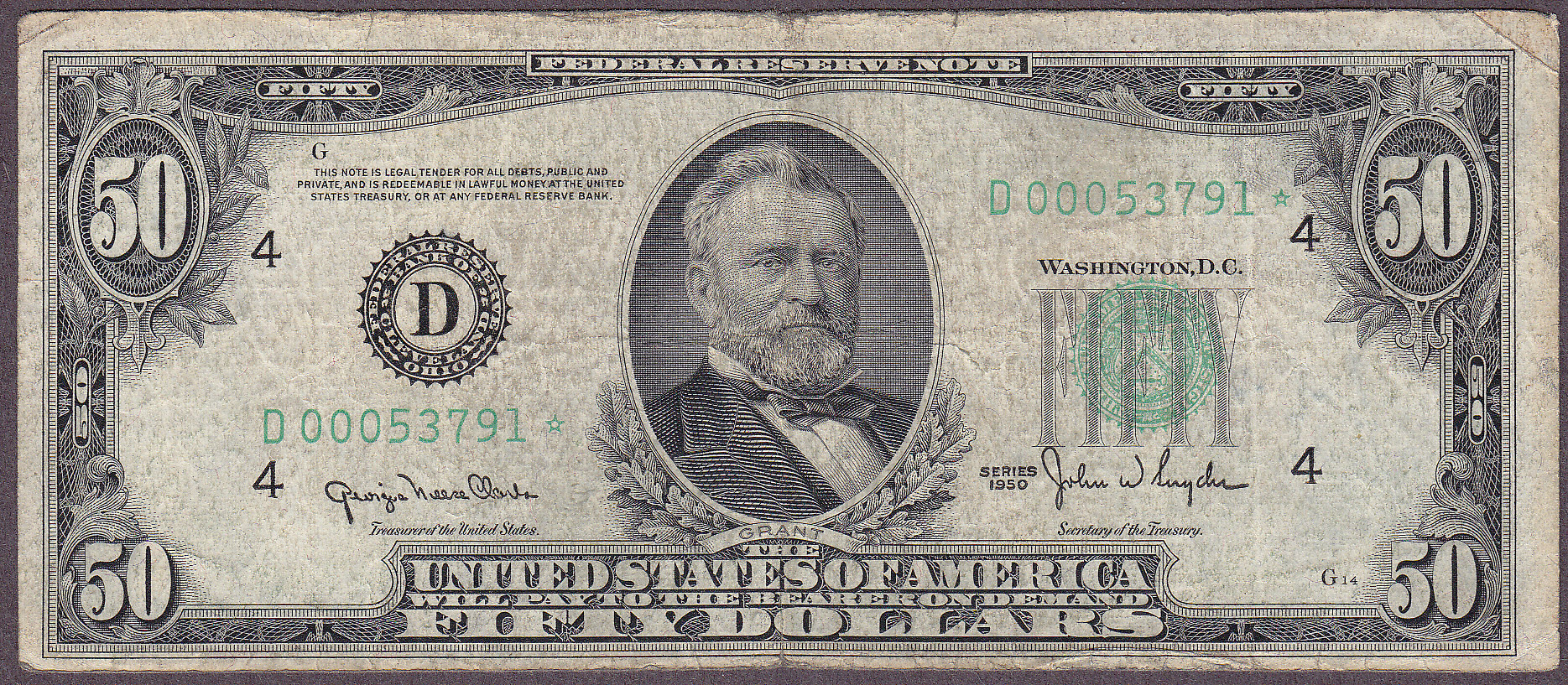 Fr.-2107D* 1950 $50 Cleveland Star FRN Ser. D00053791* Fine ++