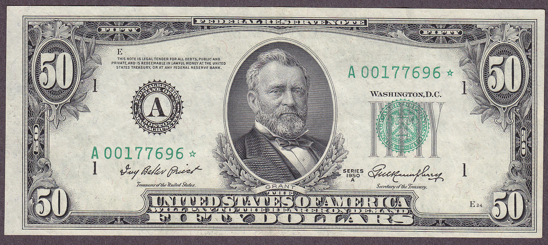 This is a very nice 1950A $50 FRN Star from the ever tough Boston District. The serial number is A00177696*. There are no rips, tears or pinholes. Check out the large scans.