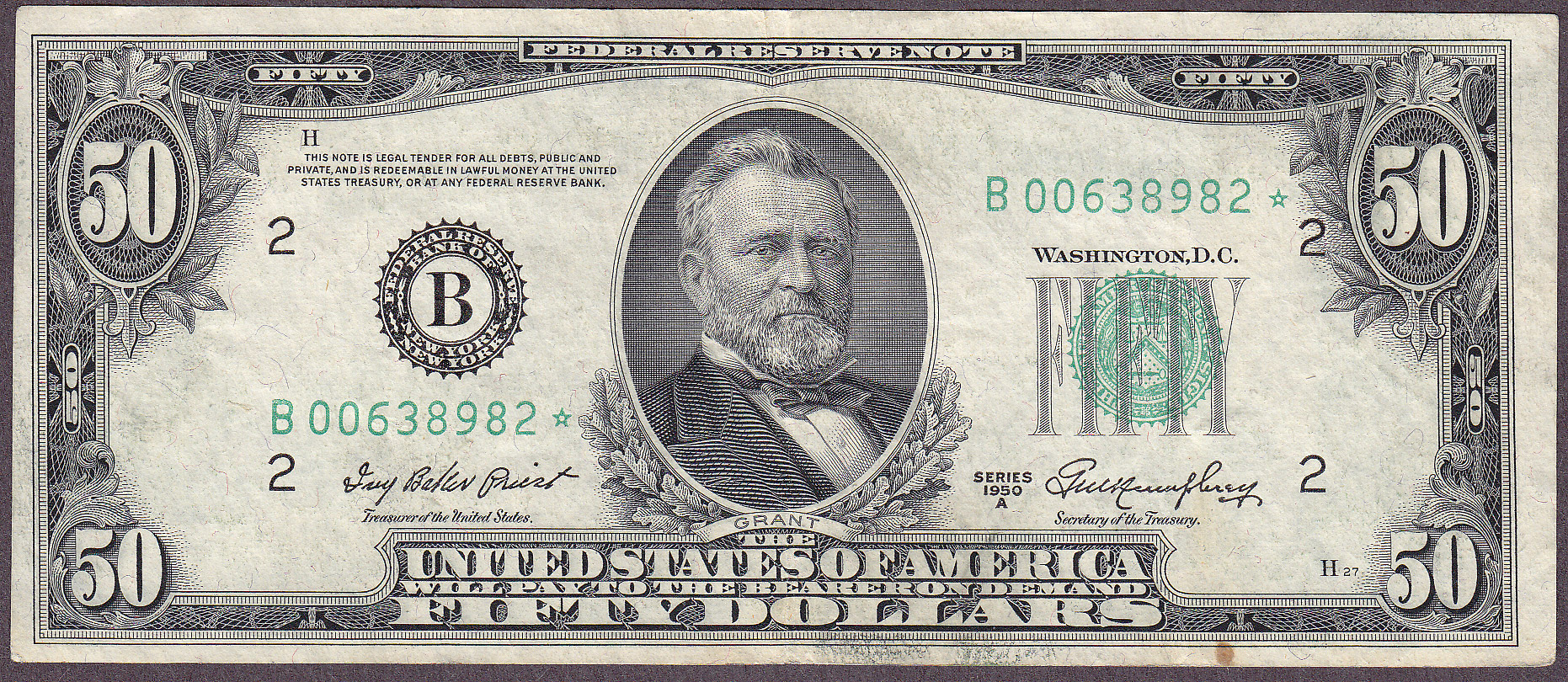 This is a very nice 1950A $50 FRN Star from the ever tough New York District. The serial number is B00638982*. There are no rips, tears or pinholes. Check out the large scans.