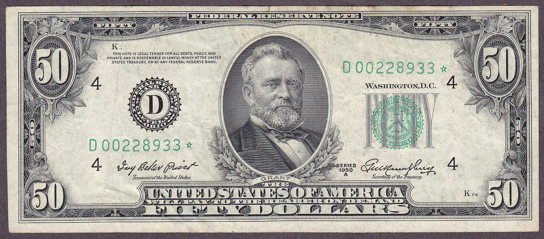This is a very nice 1950A $50 FRN Star from the ever tough Cleveland District. The serial number is D00228933*. There are no rips, tears or pinholes. Check out the large scans.