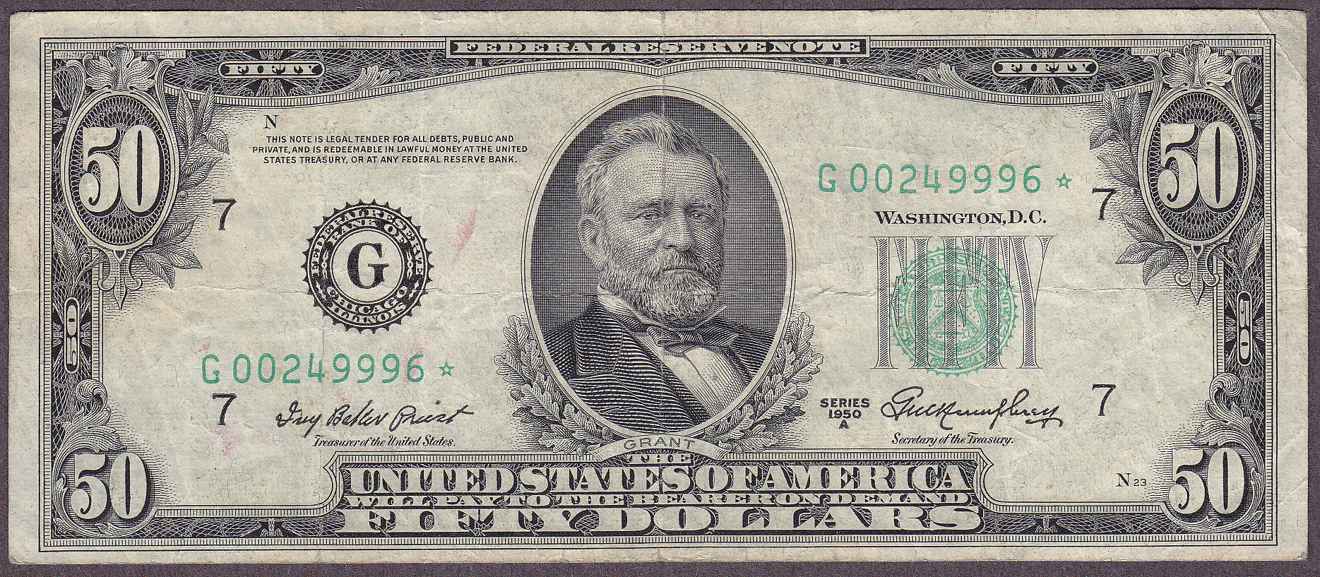 This is a very nice 1950A $50 FRN Star from the ever tough Chicago District. The serial number is G00249996*. There are no rips, tears or pinholes. Check out the large scans.