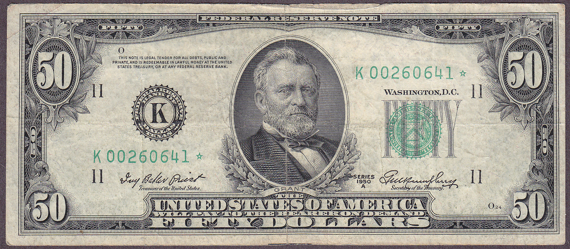 Here is a very scarce 1950A* $50 Dallas star. The serial number is K00260641*. When I purchased this note in late 2002 there were only two known at the time. The rare star note is all there with no rips, tears or pinholes. Dallas stars are one of the hardest districts to locate.