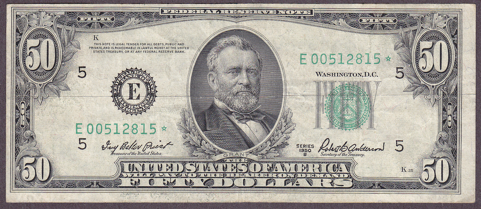 Here is an VF 1950B $50 Richmond Star. The serial number is E00512815*. No rips, tears, pinholes or bank marks. A stunning example. Richmond is one of the keys to this series.