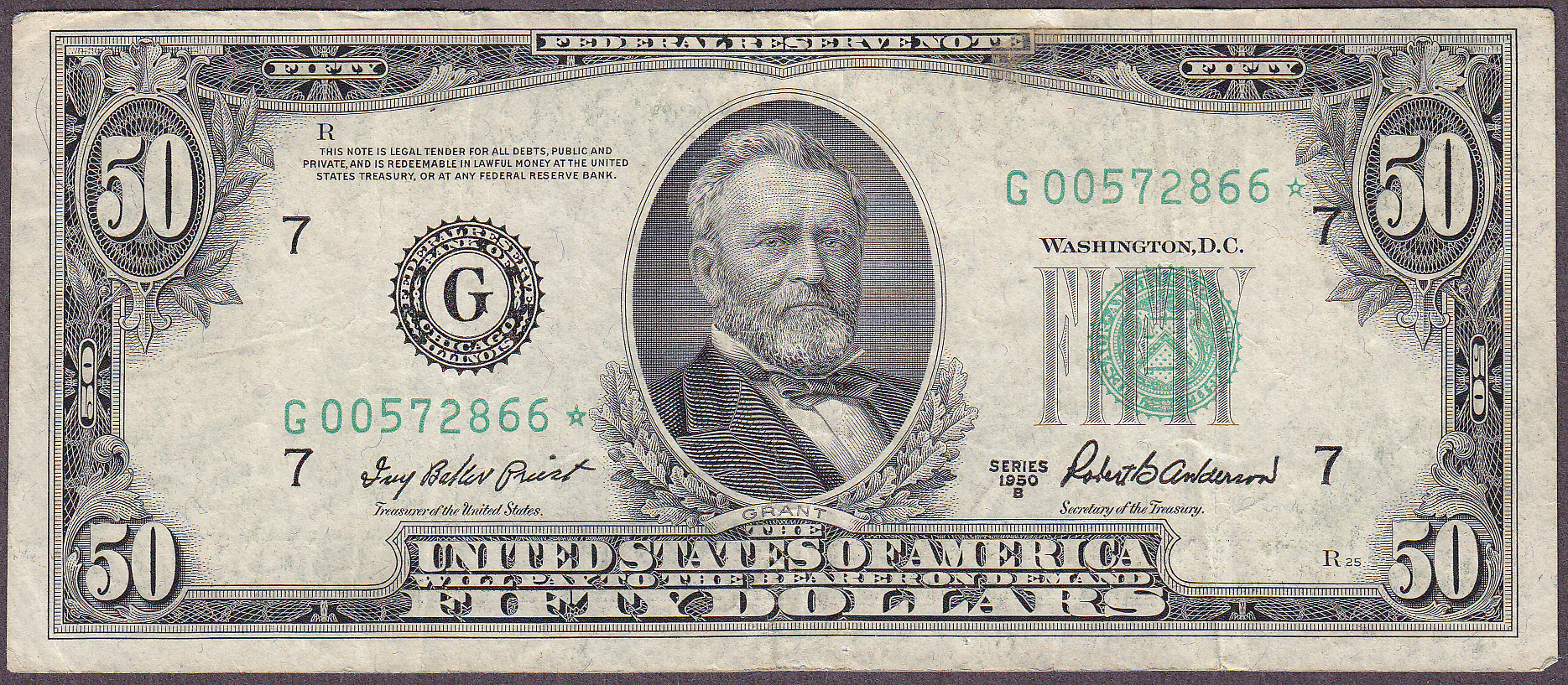 Here is an VF 1950B $50 Chicago Star. The serial number is G00572866*. No rips, tears, pinholes or bank marks. A stunning example.
