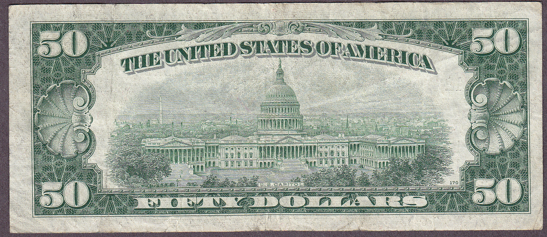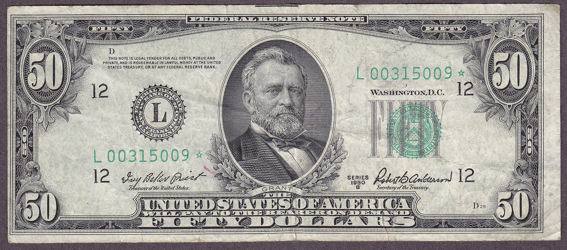 A nice example of the 1950B $50 San Francisco Star. The serial number is L00315009*. No rips, tears or pinholes.