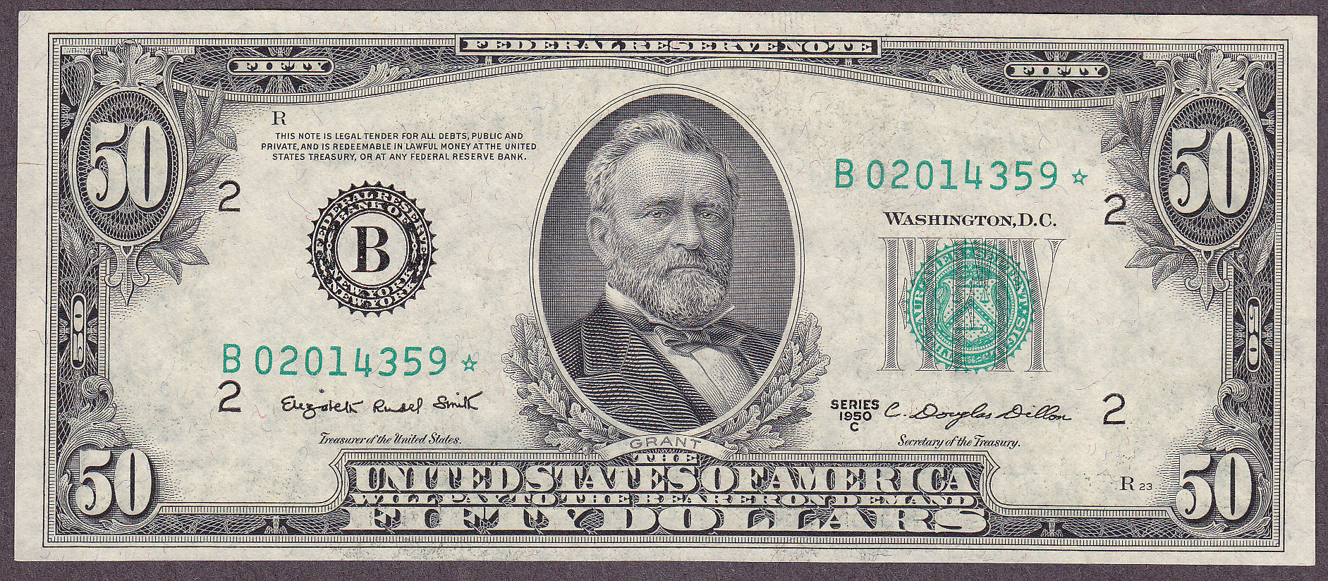 Here is an GEM 1950C $50 New York Star. The serial number is B02014359*. No rips, tears, pinholes or bank marks. A stunning example of this tough series in a star.