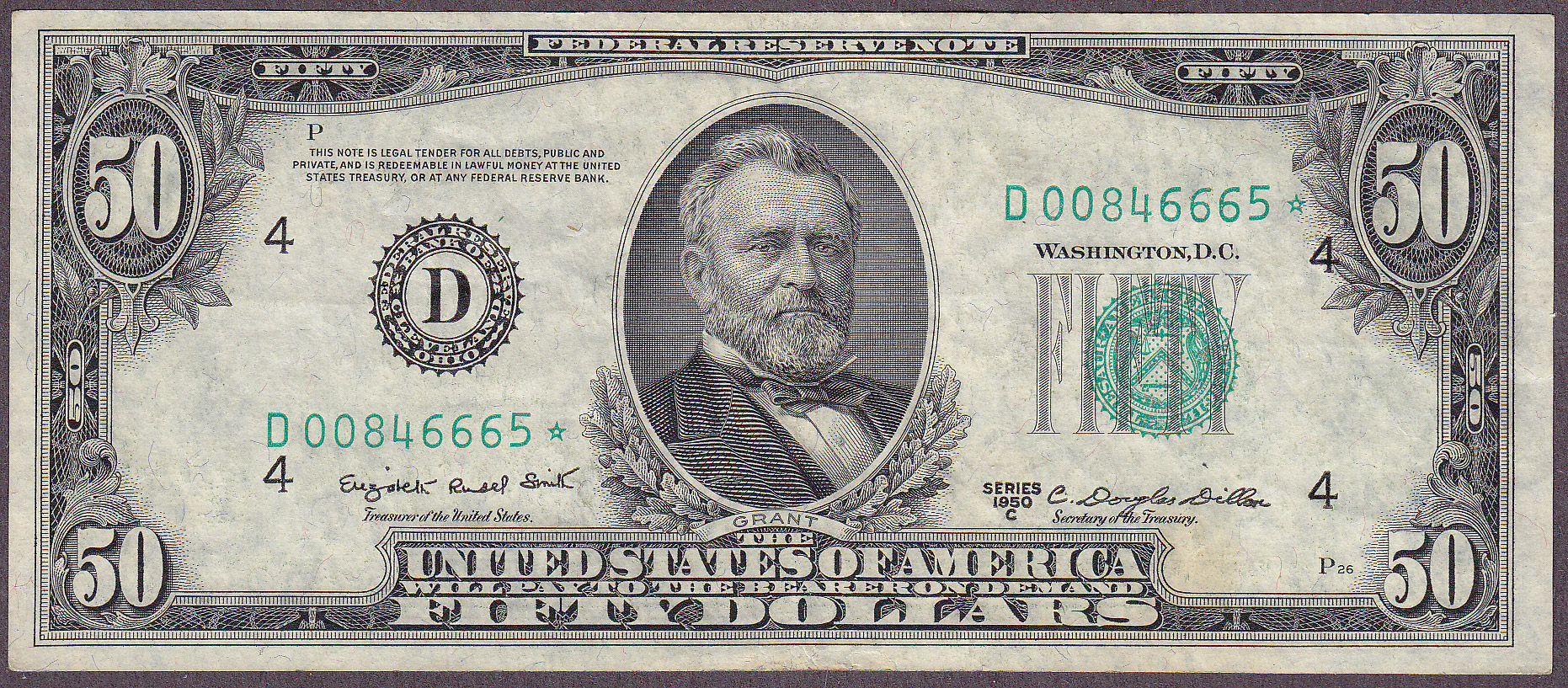 This is a new high serial number for this note in the new Oakes/Lindquest book. Here is an VF/EF 1950C $50 Cleveland Star. The serial number is D00846665*. No rips, tears, pinholes or bank marks. A stunning example of this tough series in a star.