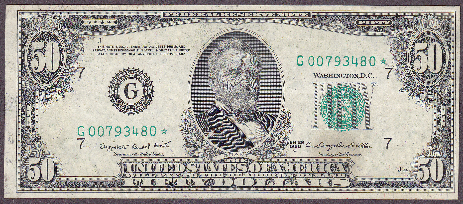 Here is an GEM 1950C $50 Chicago Star. The serial number is G00793480*. No rips, tears, pinholes or bank marks. A stunning example of this tough series in a star.