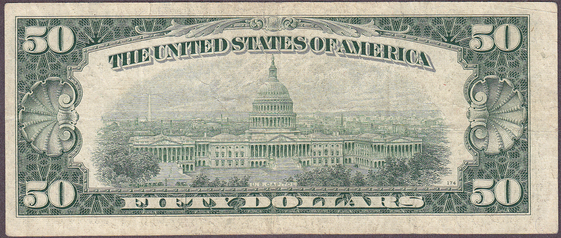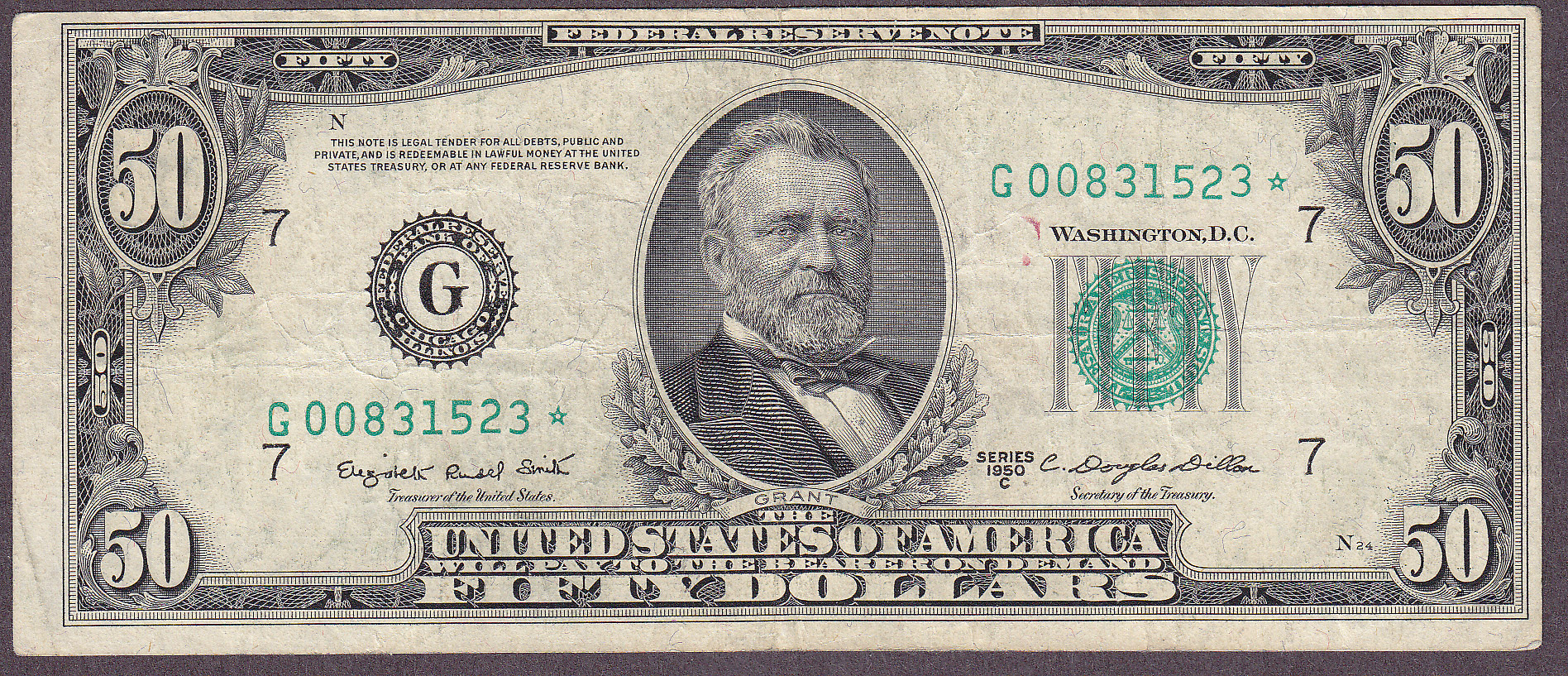 Here is an VF 1950C $50 Chicago Star. The serial number is G00831523*. No rips, tears, pinholes or bank marks. A stunning example of this tough series in a star.