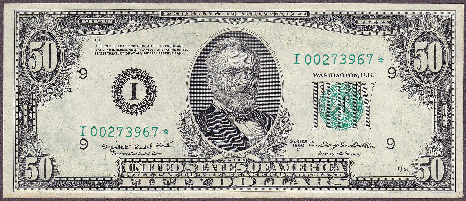 This might well be the finest small size FRN Star I own. This is an Uncirculated 1950C Minneapolis star. The serial number is I00273967*. This Minneapolis star is very rare in UNC. This is the only one I have seen or heard of. Not only is the 1950C* series scarce, it is also the rarest district and it is an Uncirculated Note. Put all this together and you have the best available.
