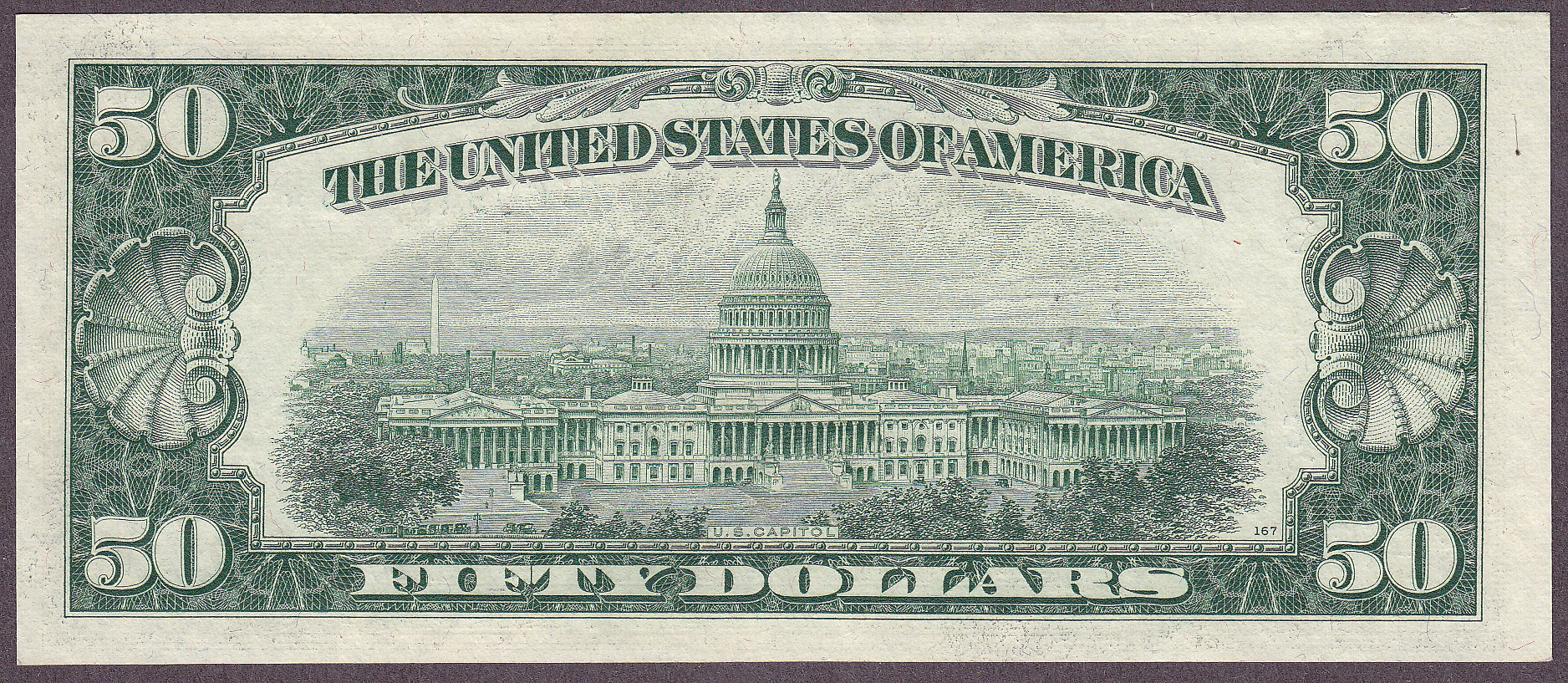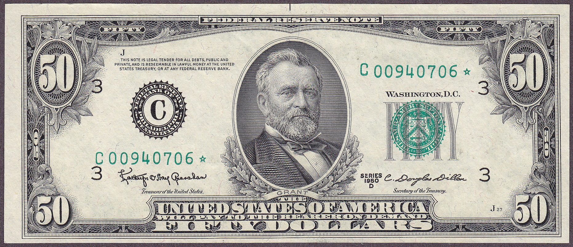 I bought this note in a 2003 Smythe auction. Here is an UNC 1950D $50 Philadelphia Star. The serial number is C00940706*. No rips, tears, pinholes or bank marks. A stunning example of this tough 1950D* series.