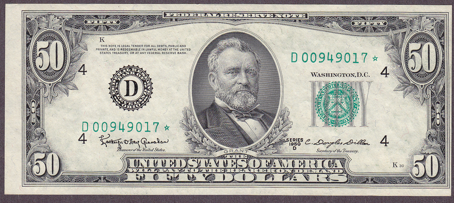 Fr.-2111* 1950-D $50 Cleveland Star FRN Ser. D00949017* UNC