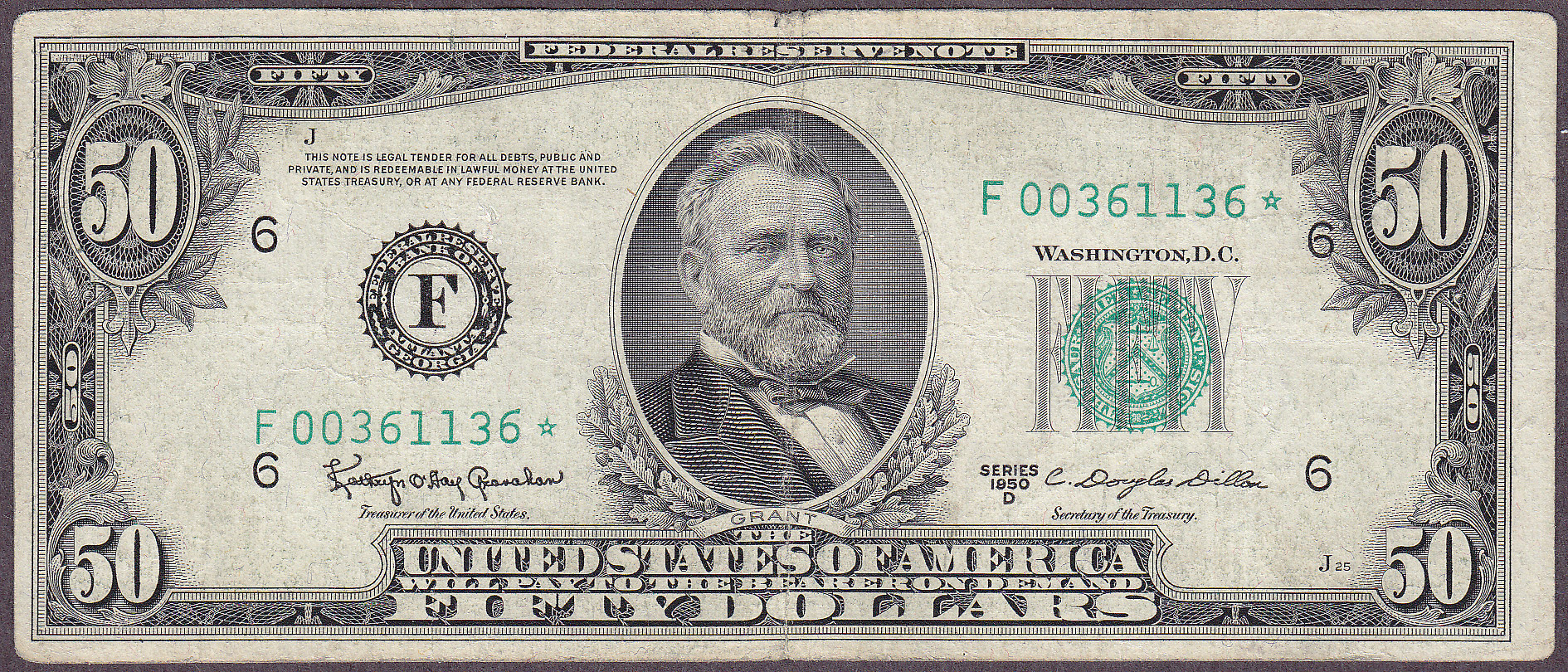 Here is an VF 1950D $50 Atlanta Star. The serial number is F00361136*. No rips, pinholes or bank marks. A stunning example of this tough 1950D* series.