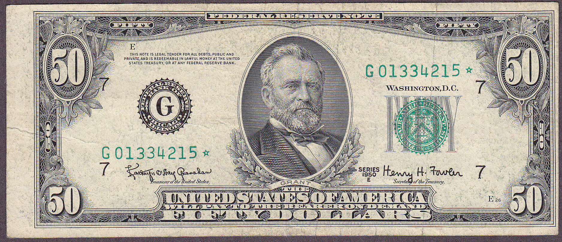 Here is an VF 1950E $50 Chicago Star. The serial number is G01334215**. No rips, tears, pinholes or bank marks. Everyone know that the 1950E series is very rare. They only printed New York, Chicago and San Francisco notes. All star notes from these three districts are very rare.