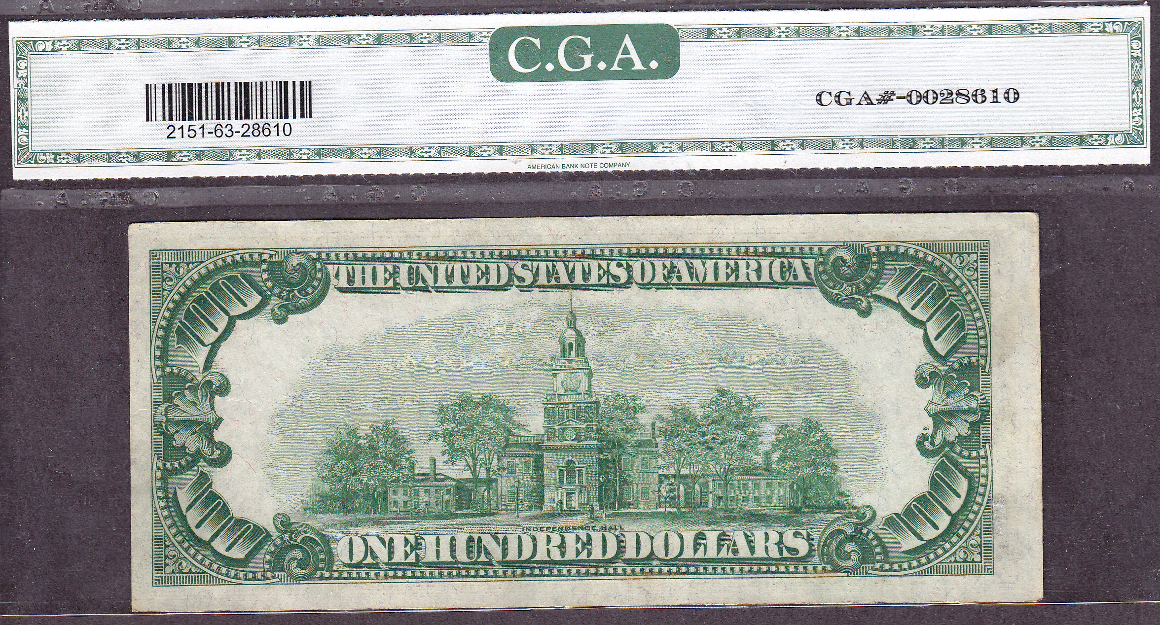 This is a very nice and HARD TO FIND 1928A $100 FRN from the Philly District. It has been graded CGA-63 Choice Uncircluated. THE BACK PLATE NUMBER IS # 25.